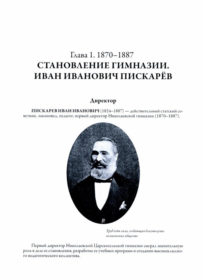 Книга является продолжением двух ранее вышедших книг К. И. Финкельштейна, посвященных гимназии: "Императорская Николаевская Царскосельская гимназия" (2008) и "Императорская Николаевская Царскосельская гимназия. Ученики" (2009). За 7 лет автором были изучены более 500 архивных дел (12 000 с лишним листов исторических документов). Результатом стала эта книга, включающая в себя биографии 180 преподавателей, служивших в гимназии за ее почти 50-летнюю историю (1870-1918). Абсолютное большинство биографий никогда ранее не публиковалось. Эта книга-памятник, наша дань уважения учителям прошлого. Благодаря беззаветному служению педагогов Николаевской гимназии из ее стен вышло столько выдающихся людей, внесших весомый вклад в развитие науки, культуры, образования, промышленности, военного дела не только в России, но и за рубежом. Публикация приурочена к 150-летию со дня основания гимназии, 165-летию со дня рождения ее самого известного директора-поэта И. Ф. Анненского и 5-летней годовщине со дня открытия Музея Николаевской гимназии (ГБУ ДО Центр детско-юношеского технического творчества и информационных технологий Пушкинского района Санкт-Петербурга).
