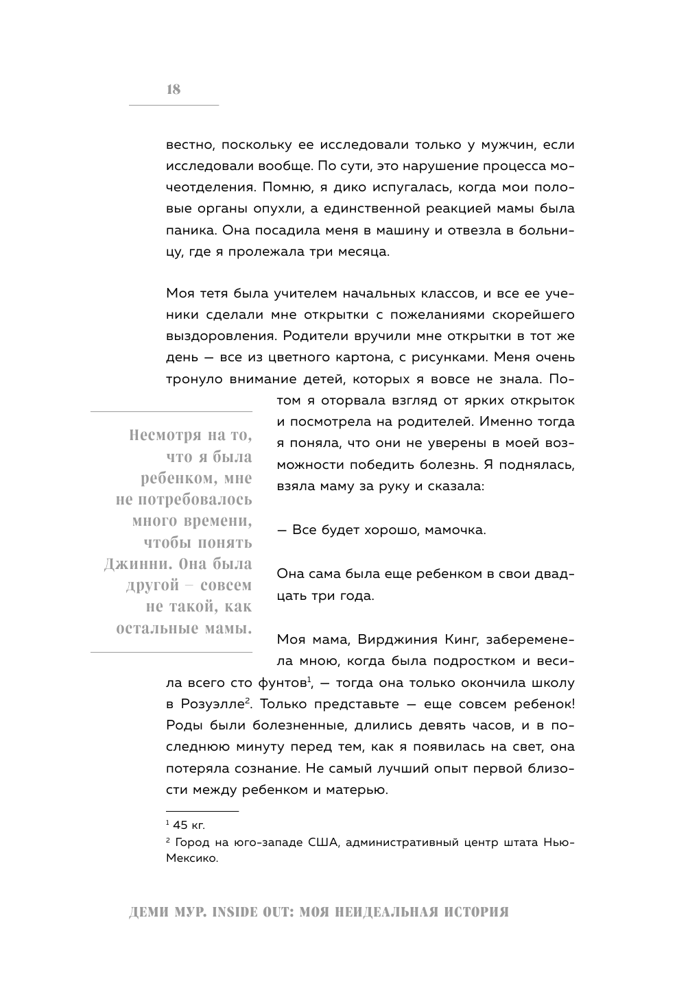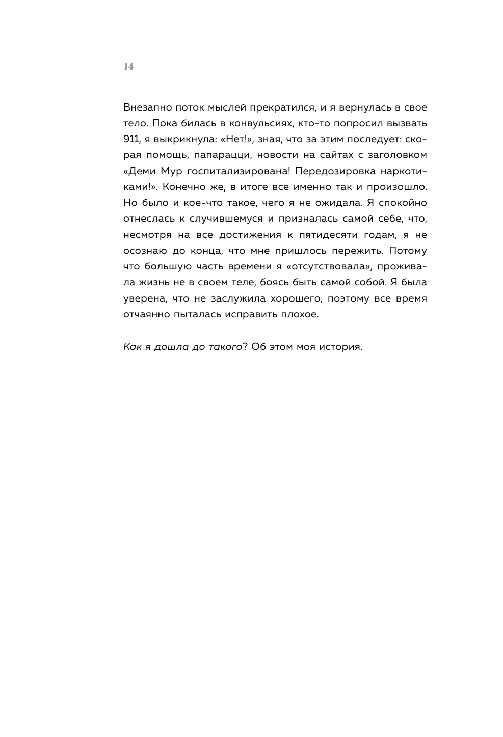 В этой книге есть и душераздирающие признания, и пикантные подробности, но главное — здесь есть неподдельная откровенность. Деми Мур безжалостно разбирает собственные ошибки, великодушно прощает их другим и от главы к главе учится принимать и любить себя.