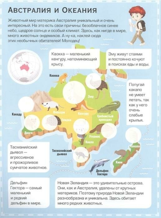 Книга тонкая, но чтобы познакомить с животным миром и континентами в самый раз. Глобуса у нас нет, поэтому решила поискать что-то, чтобы дать первое представление для сына 3,2 года. И не пожалела. Наклейки, небольшие описания, яркие цвета сделали свое дело. Ребенок слушает, ищет и запоминает. Рекомендую
