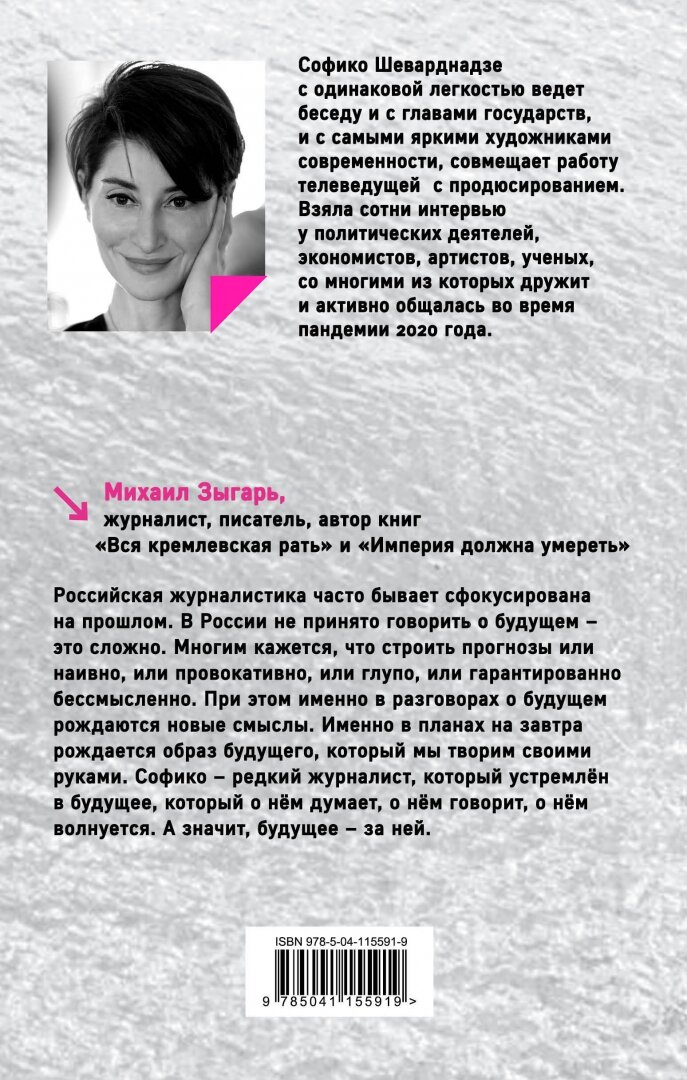 Эта книга - прежде всего лирический дневник обычного человека, переживающего совершенно неординарную ситуацию. В тех событиях, надеждах и страхах, о которых пишет Софико, любому читателю легко узнать себя: да, мы точно так же волновались за здоровье близких, спешили к ним через стремительно закрывающиеся границы, отменяли уже готовые планы и строили новые, чтобы потом снова их отменить, искали (и находили) у себя самые пугающие симптомы, боролись с внезапно навалившимся сном в течение дня, с бессонницей ночью и с тревогами в любое время суток, учились работать, дружить и влюбляться в зуме и пытались угадать, что ждет нас дальше. Наверное, когда-нибудь по этой книге мы сможем вспомнить, что происходило с нами в это странное время. Важное и существенное отличие лишь в том, что у Софико Шеварднадзе в этой неординарной ситуации были очень необычные собеседники: вирусологи и художники, экономисты и футурологи, нобелевские лауреаты и авторы интеллектуальных бестселлеров. И пока автор проживает эти тревожные месяцы, герои ее интервью объясняют, что с нею - и с нами - происходит.