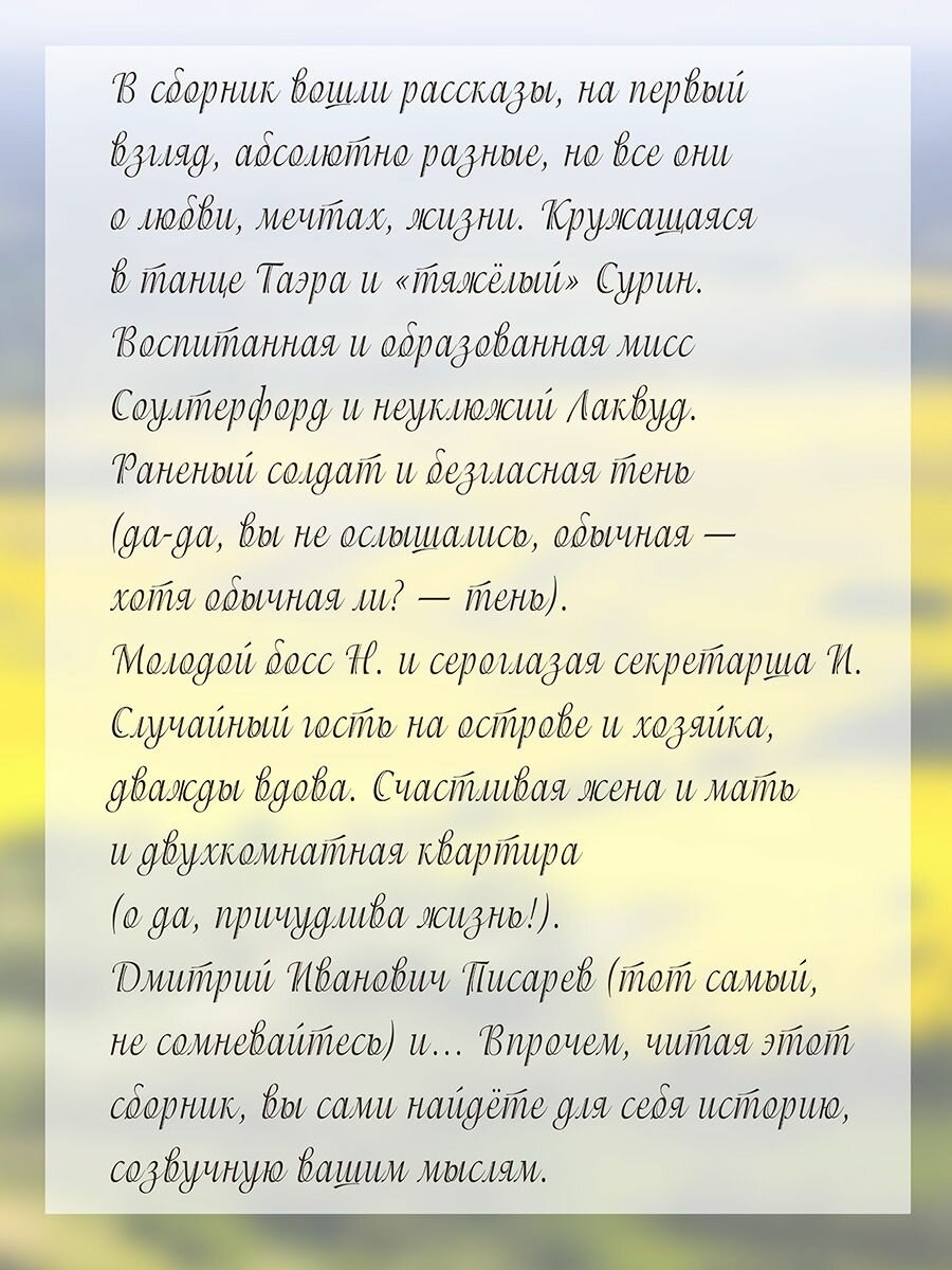 Он и Она. Что может быть прозаичнее и в то же время возвышеннее? В сборник вошли рассказы, на первый взгляд, абсолютно разные, но все они о любви, мечтах, жизни. Кружащаяся в танце Таэра и «тяжёлый» Сурин. Воспитанная и образованная мисс Соултерфорд и неуклюжий Лаквуд. Раненый солдат и безгласная тень (да-да, вы не ослышались, обычная – хотя обычная ли? – тень). Молодой босс Н. и сероглазая секретарша И. Случайный гость на острове и хозяйка, дважды вдова. Счастливая жена и мать и двухкомнатная квартира (о да, причудлива жизнь!). Дмитрий Иванович Писарев (тот самый, не сомневайтесь) и… Впрочем, читая этот сборник, вы сами найдёте для себя историю, созвучную вашим мыслям.