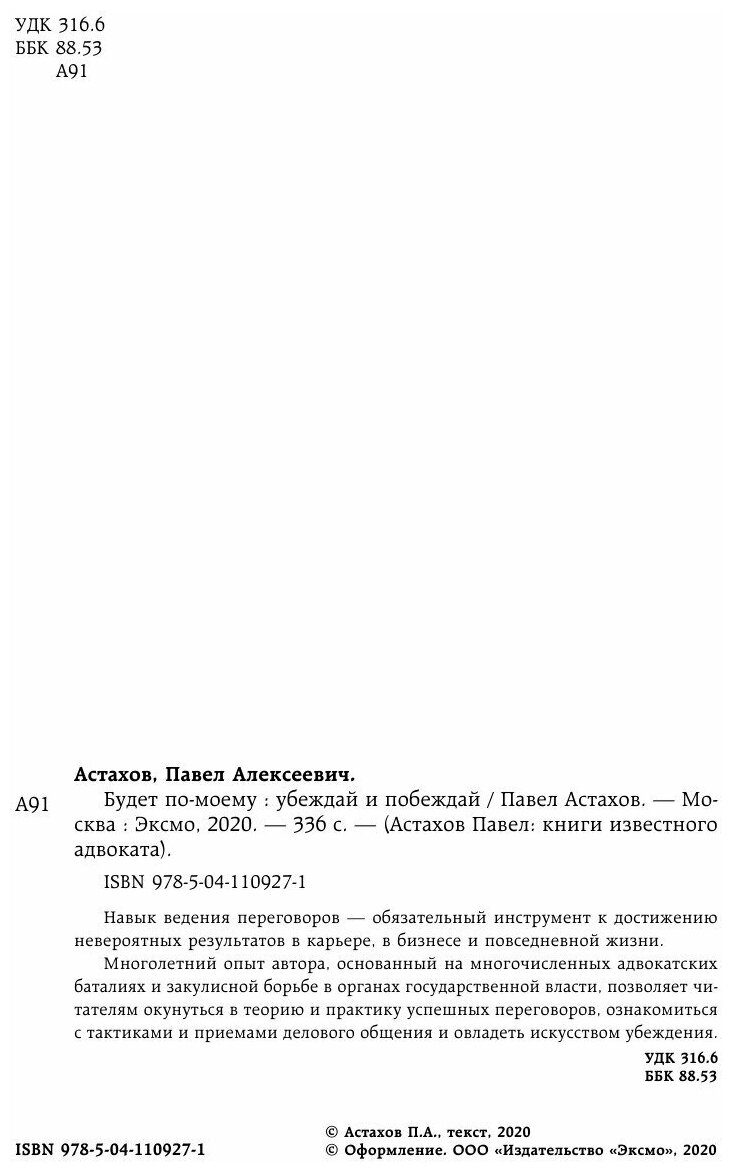 Многолетний опыт автора, основанный на многочисленных адвокатских баталиях и закулисной борьбе в органах государственной власти, позволяет читателям окунуться в теорию и практику успешных переговоров, ознакомиться с тактиками и приемами делового общения и овладеть искусством убеждения.