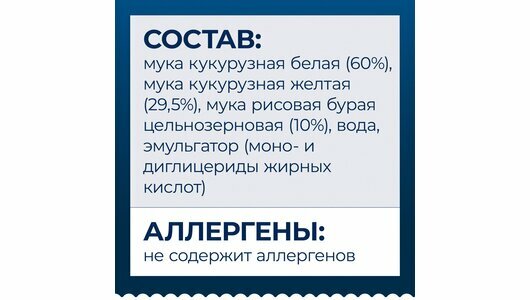 Состав: Мука кукурузная белая 65%, мука кукурузная желтая 29,5%, мука рисовая 5%, вода, эмульгатор (моно- и диглецириды жирных кислот)