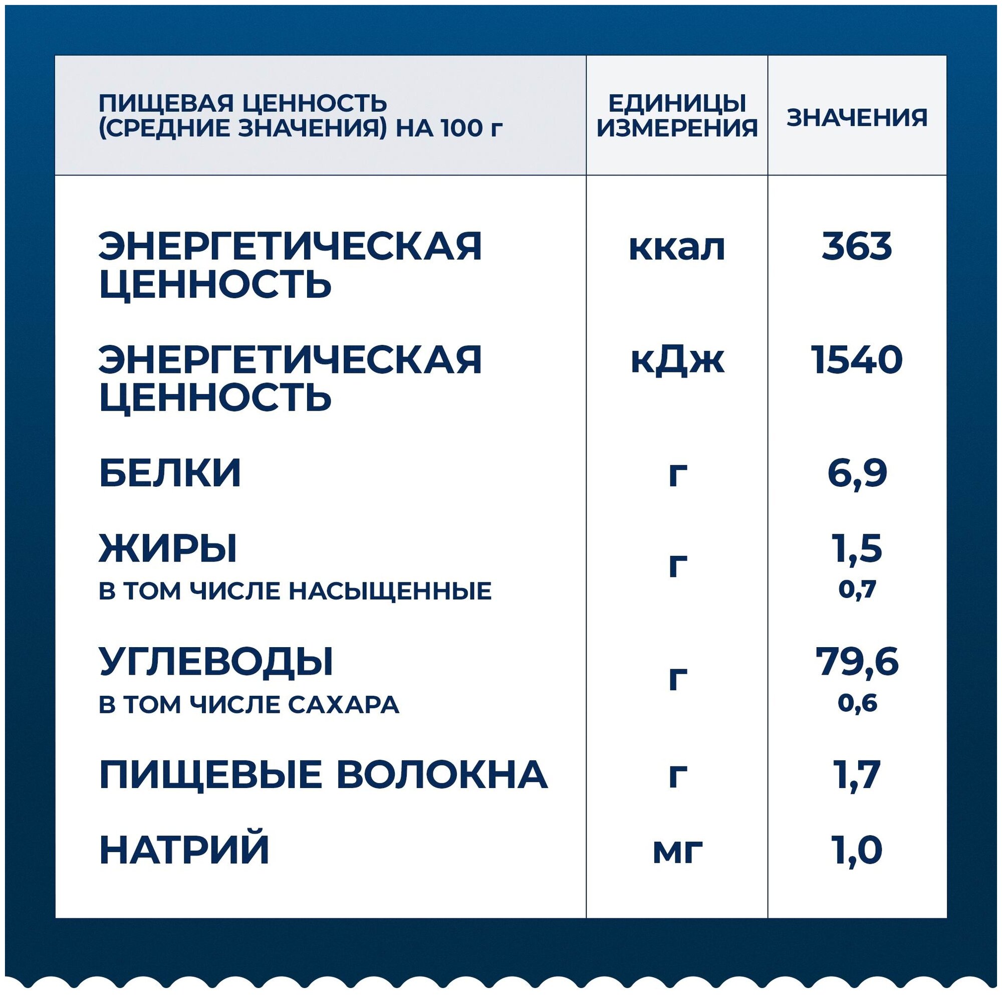 Пищевая ценность на 100 г: белки 6.5 г, жиры 1.8 г, углеводы 63 г, энергетическая ценность 287 ккал