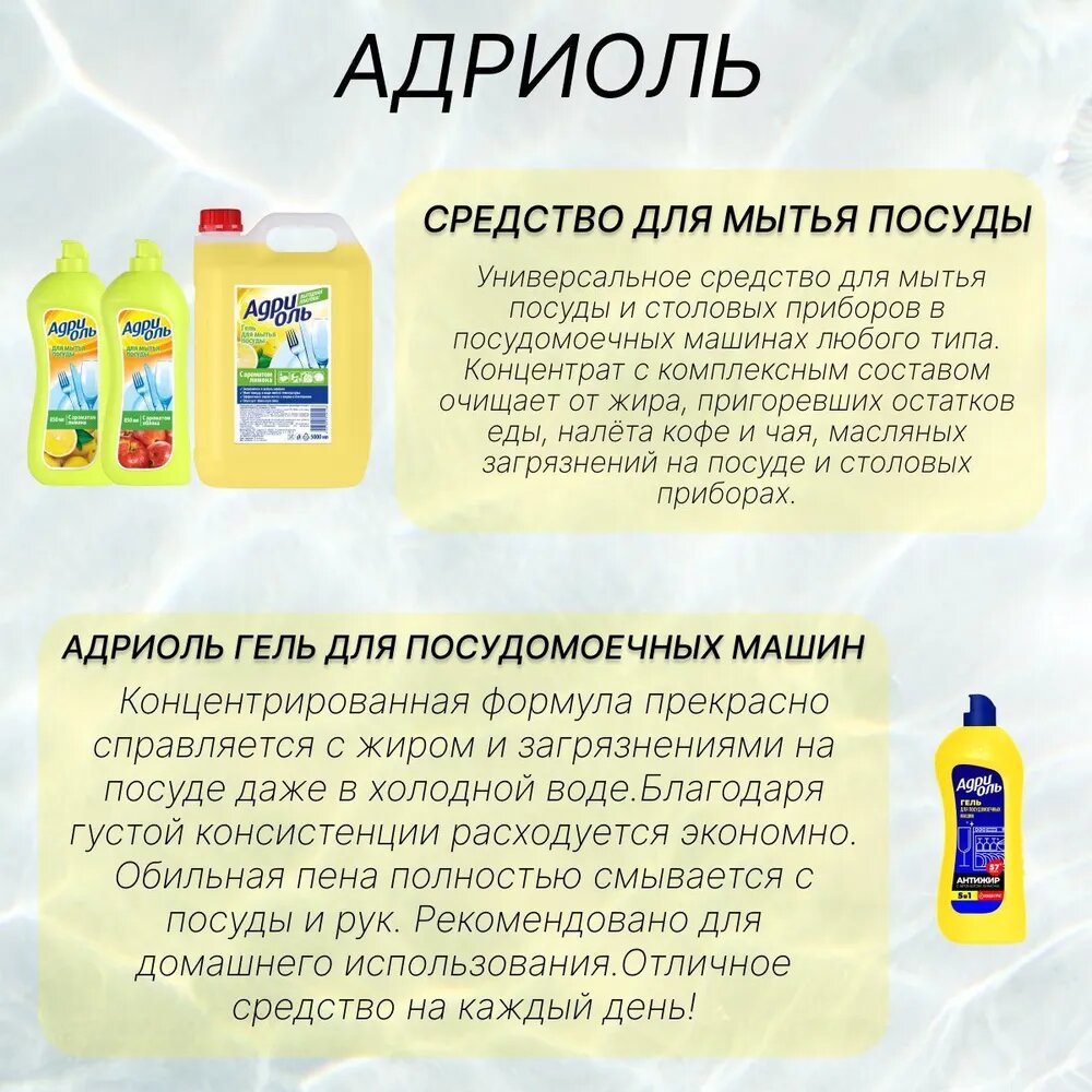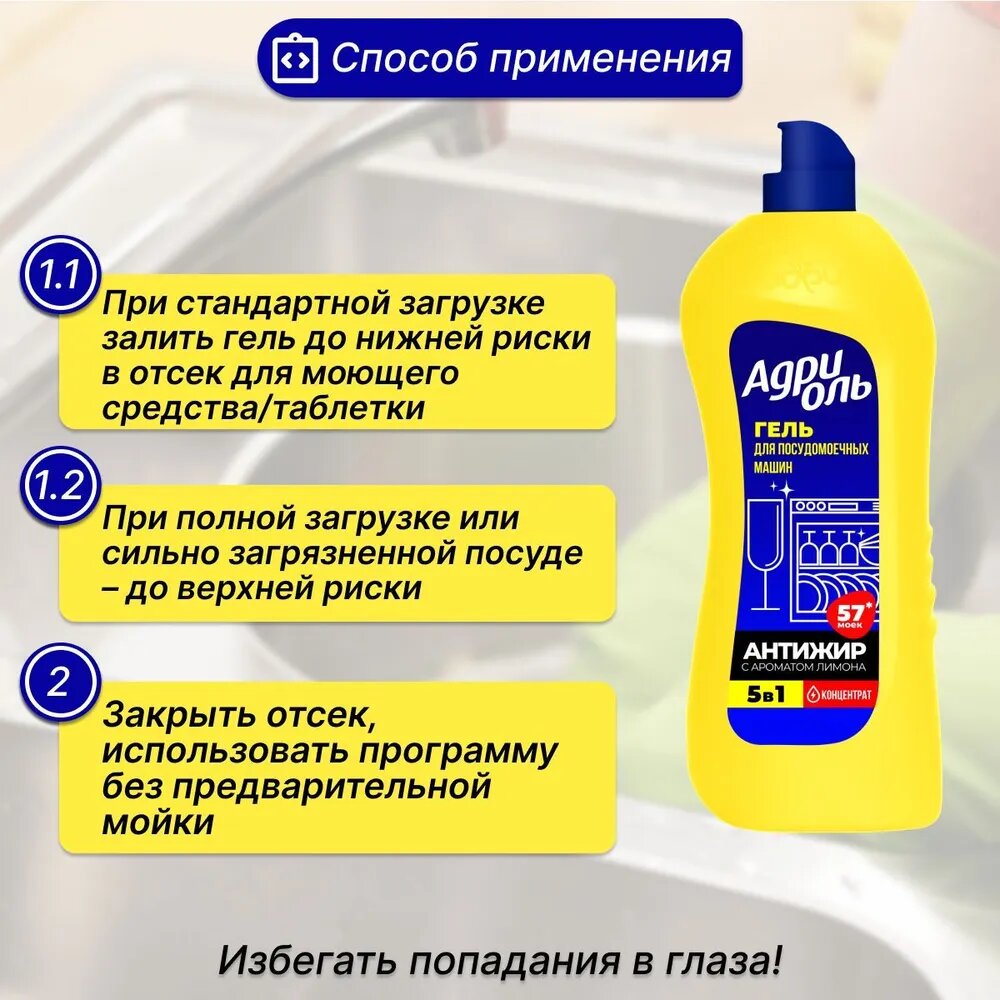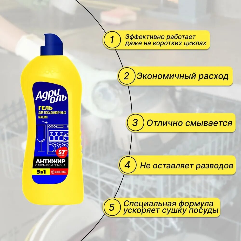 Название: Гель для посудомоечной машины "Адриоль" Блеск и сушка. Гель для мытья посуды Адриоль - это отличное средство для тех, кто ценит качество и бережное отношение к своей посуде. Он работает при низких температурах, не царапая поверхность, и быстро справляется с жирами, остатками пищи и старыми загрязнениями. Гель Адриоль также защищает от помутнения и разводов, обеспечивает быструю сушку и легкое смывание, а благодаря удобству дозирования и экономному расходу, он является еще и выгодным приобретением.Объем геля Адриоль составляет 850 мл, что позволяет использовать его для мытья небольшого количества посуды. Гель имеет концентрированную формулу, что делает его более экономичным по сравнению с обычными средствами для посудомоечных машин. Он не содержит хлора, что делает его безопасным для использования в доме, где есть дети и животные.Гель Адриоль Блеск и сушка - это отличный выбор для тех, кто хочет иметь чистую и блестящую посуду без лишних усилий.