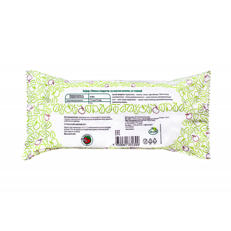 | Состав | подсластитель изомальт, патока мальтозная, мальтодекстрин, пюре яблочное, белок яичный, желеобразователь пектин, регулятор кислотности кислота молочная, влагоудерживающий агент лактат натрия, подсластитель экстракт стевии (стевиозид), идентичный натуральному ароматизатор «ваниль», ванилин |