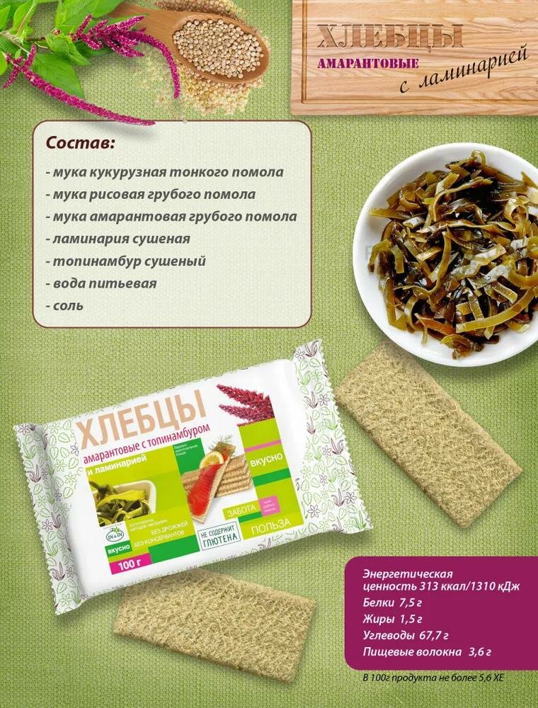 | Состав | мука амарантовая, мука рисовая, мука кукурузная, топинамбур сушеный, ламинария сушеная, соль |