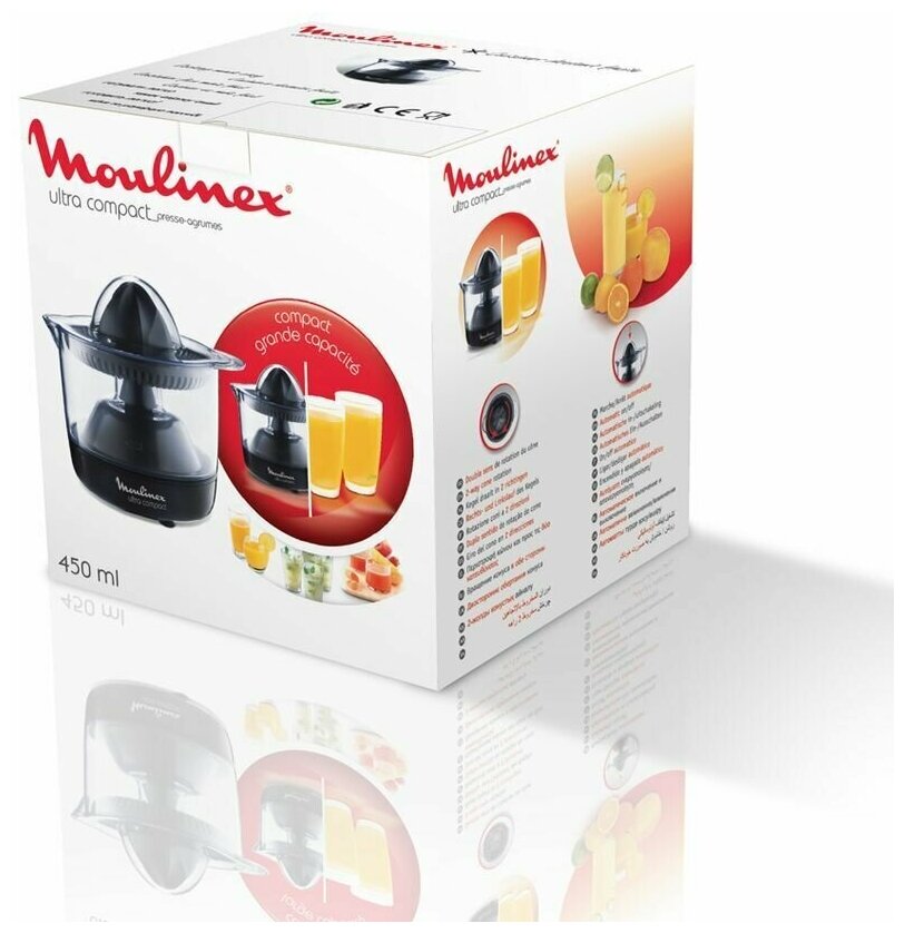 Соковыжималка для цитрусовых JM Moulinex имеет компактный размер в сочетании с большой ёмкостью. Потребляемая мощность устройства — 25 В. Настройка скорости производится автоматически. Автоматический запуск Включить аппарат можно одним нажатием на конус в верхней части корпуса. Выключение производится таким же методом. Удобное хранение Компактное устройство легко помещается в кухонный шкаф небольшого размера. Корпус JM «Мулинекс» оснащён отсеком для хранения шнура.