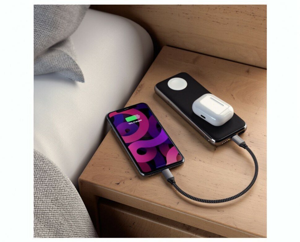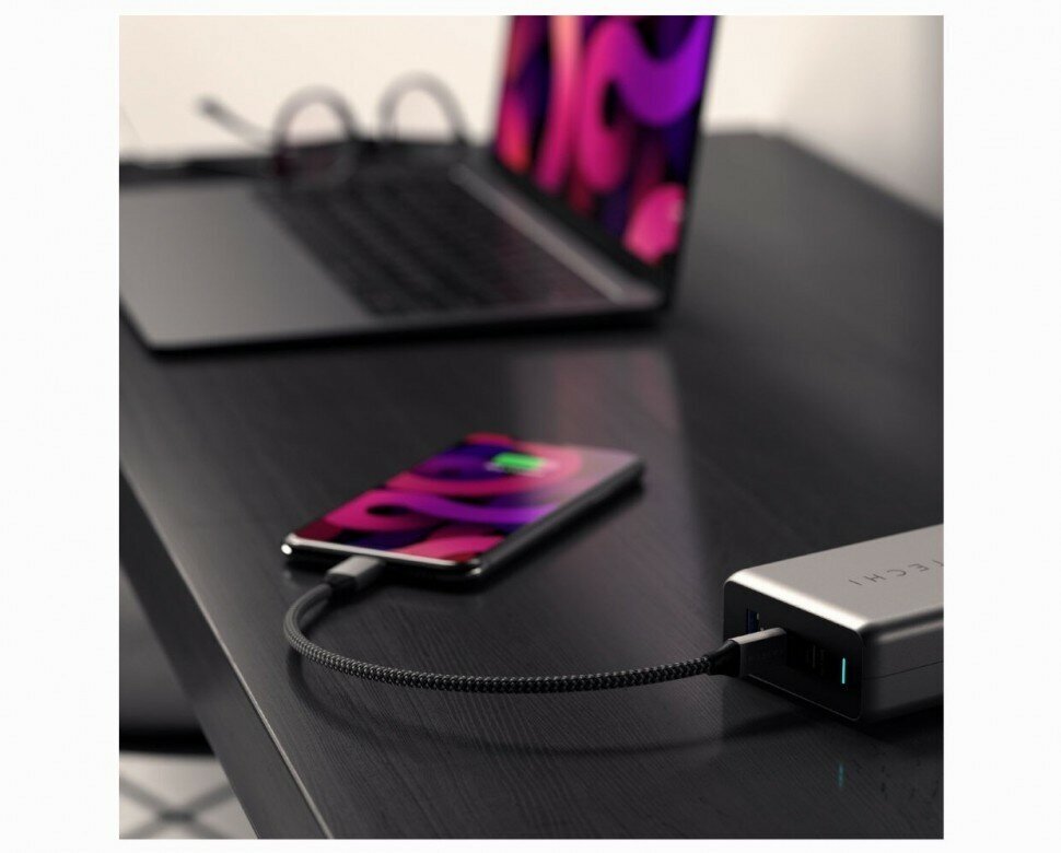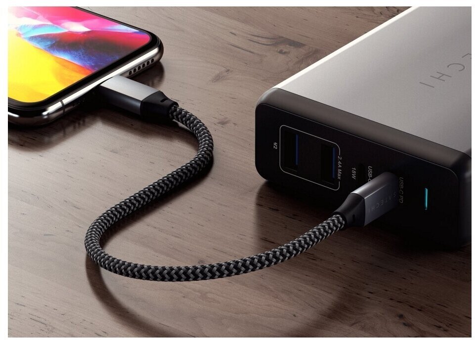 Зарядите свои устройства Apple Lightning с помощью зарядного кабеля Satechi USB-C - Lightning с двусторонним разъемом USB-C, более коротким кабелем и сертификатом Apple MFi для удобства при зарядке. Кабель USB-C Lightning идеально сочетается с нашим беспроводным аккумулятором Quatro Wireless Power Bank или настольным зарядным устройством Pro 108 Вт для домашнего офиса или в дороге.
