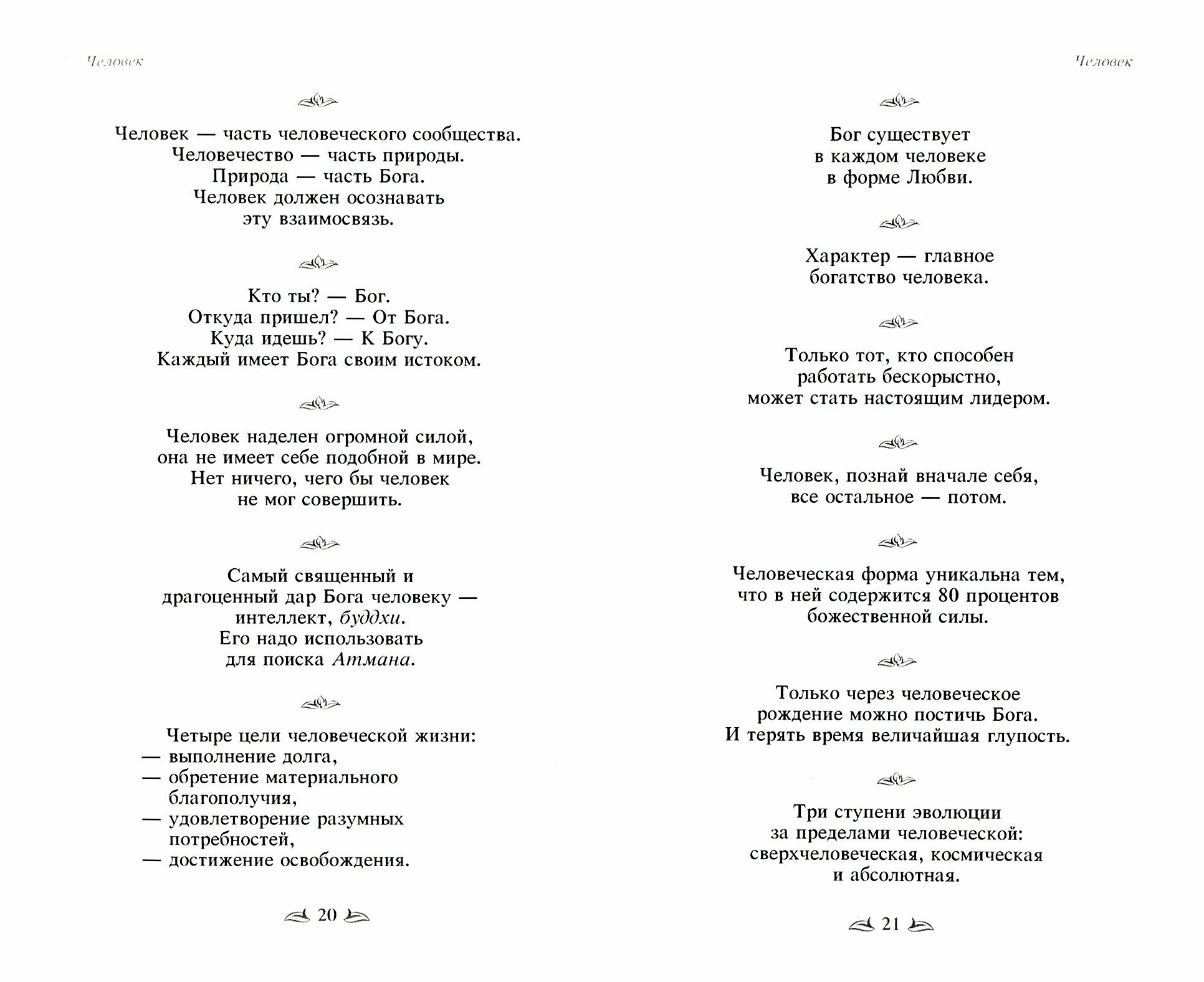 В книге собраны высказывания Аватара Шри Сатья Саи Бабы по духовным аспектам многих направлений человеческой жизнедеятельности, показано как от них зависит состояние человека, общества, нации и всего человечества. Притчи, рассказанные Им для иллюстрации ведических истин, а также Наставления, помогающие понять глубины Божественной Мудрости, помогут читателю найти ответы на многие вопросы, волнующие современного человека. Истины, заложенные в притчах, афоризмах и наставлениях могут помочь каждому человеку и обществу как в обретении смысла и цели жизни, так и в управлении процессами, влияющими на построение экономически развитого и справедливого общества.