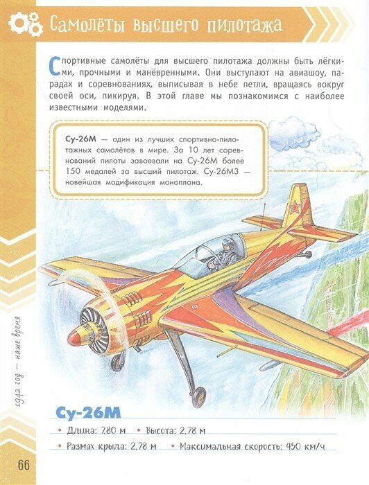 Книга хорошая! Большой формат. Крупным планом самолеты, могут быть на 2 разворота. Самолеты рисованные, но понятно и разборчиво, с деталями. Плюс: самолеты по периодам истории, краткое описание самолета: его достоинство и событие с ним. Особенно мне приятно: выделен период Великой отечественной войны, где представлены некоторые распространенные самолеты как советские, так и немецкие!