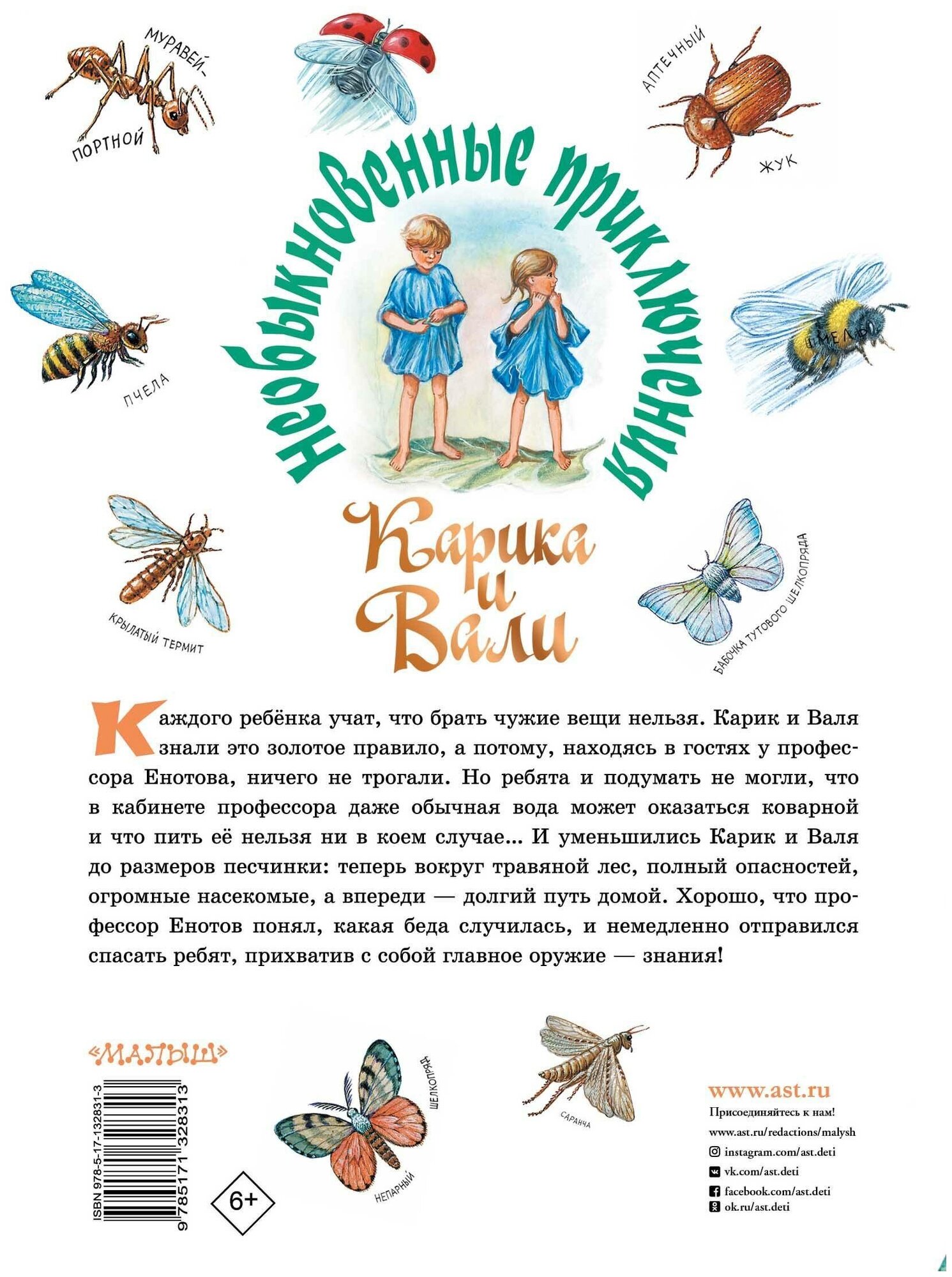 Эта удивительная история про брата и сестру, Карика и Валю, которые, выпив волшебный эликсир, уменьшились до размеров песчинки и попали в мир растений и насекомых. Здесь царят свои законы, и ребятам приходится непросто, потому что на каждом шагу их подстерегает опасность. Но на помощь им спешит мудрый профессор - он то сразу догадался, что случилось с ребятами.