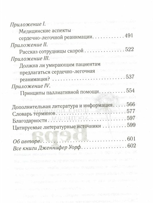 Дженнифер Уорф очень много размышляет в книге о действительной необходимости медицинского вмешательства в естественный ход вещей, об эвтаназии, о невысоком показателе успешности сердечно-легочной реанимации в долгосрочной перспективе, об табуированности темы смерти в нашей повседневной жизни, об умирании самого человека или умирании кого-то из его близких.