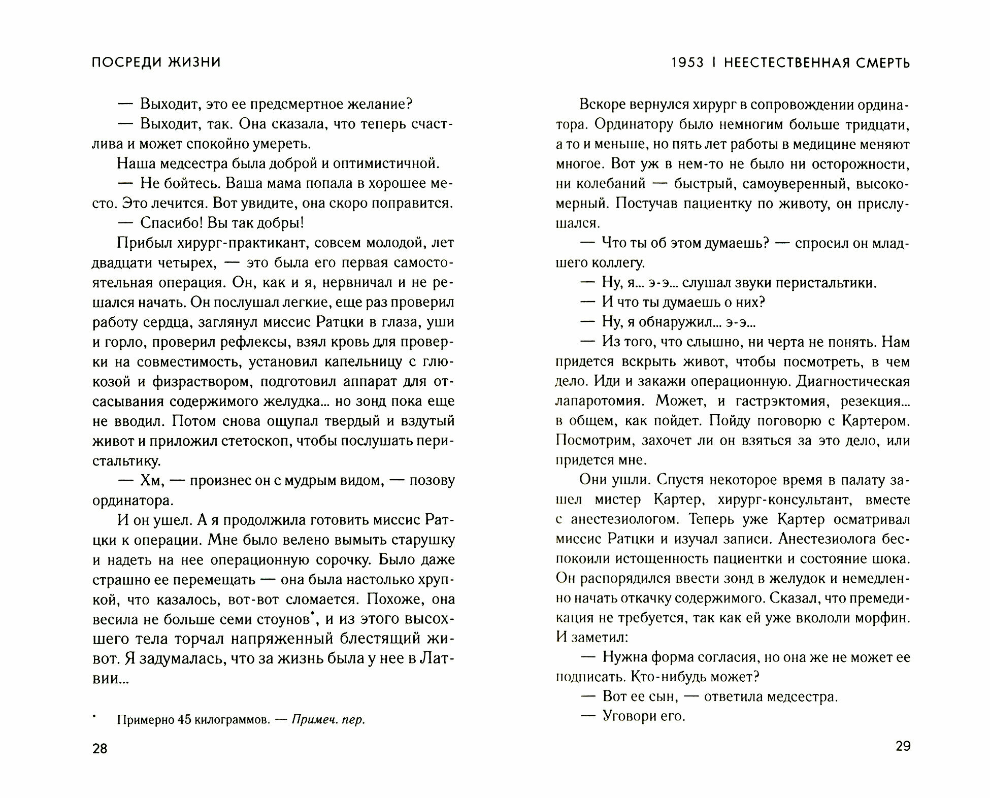 «Посреди жизни» — воспоминания Уорф о работе с пациентами, чье время неумолимо подходит к концу. Это невероятные по силе эмоций, полные любви, сострадания и жажды жизни истории о самой Дженнифер, о людях, за которыми она ухаживала, и об их близких. Многолетний опыт и точные наблюдения Уорф — ценный источник знаний о медицине того времени и удивительная возможность задуматься о самом важном в своей жизни и жизни близких людей.
