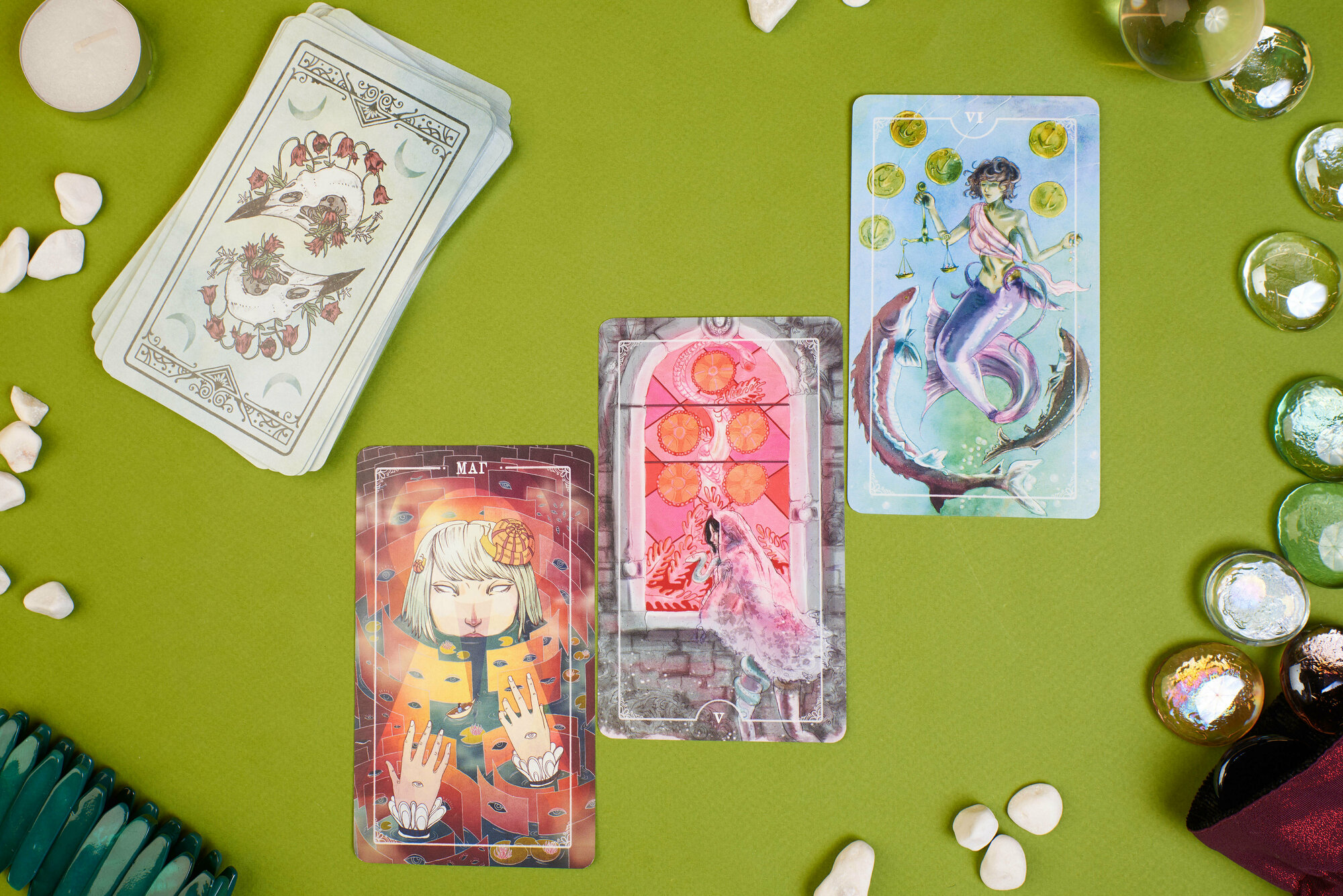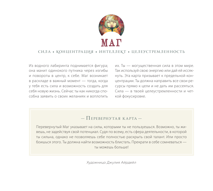 Что касается самой колоды: она совсем не такая, как ее описание (метания и сомнения ищущей себя барышни), а мрачноватая, загадочная и любит пугать. И точно знает обо мне то, чего я сама не очень хочу.