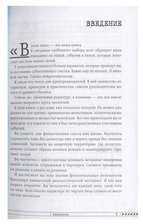 Современный интерактивный формат, ты не просто читаешь, а как будто присутствуешь на мастер-классе автора, имея возможность проверить свои собственные наблюдательность и интуицию, причем сам автор – не мифический персонаж, а реальный человек, который открыт и доступен для коммуникации. Сюжет очень динамичный благодаря большому количеству коротких разнообразных смысловых блоков, заскучать просто не успеваешь. Большая плотность информации, каждый из этих отдельных сюжетов можно развернуть в новую книгу, и очевидно, что автору есть чем поделиться с читателем: огромный (24 года, карл!) практический опыт и хорошая теоретическая база в рамках классического современного научного представления о вопросе. Цели, которые автор заявил, достигнуты на сто процентов: знакомство с научной физиогномикой, демонстрация ее информативности, и да, после прочтения хочется освоить этот метод, чтобы, применяя его на практике, научиться наконец разбираться в людях и их мотивах, улучшить качество общения с близкими и вообще повысить уровень и экологичность своего социального взаимодействия.