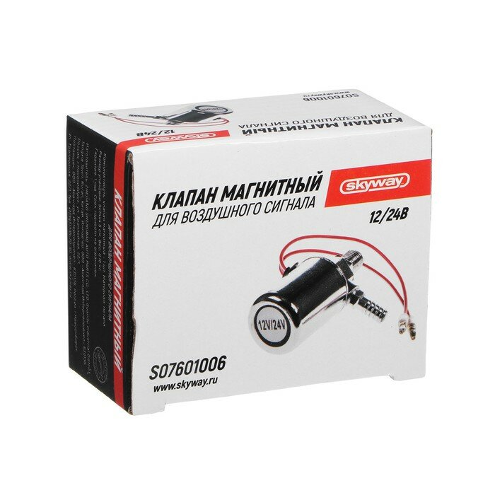 Клапан магнитный SKYWAY 006 для воздушных сигналов 12V/24V - магнитный клапан является частью звуковых сигналов. Работа клапана устроена следующим образом: во время активации подается воздух и вибрирует мембрана, в результате чего издается звук, усиливающийся за счет раструба. Такой громкий звук позволяет предупредить и оповестить других участников дорожного движения о своем присутствии или движении, обеспечивая безопасность в пути или на парковочной зоне. Клапан выдерживает макс. 45A. Тип: Магнитный.