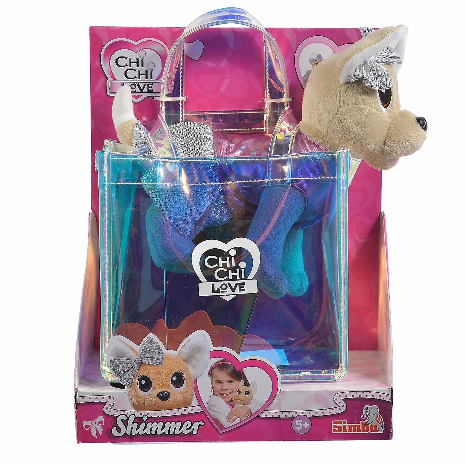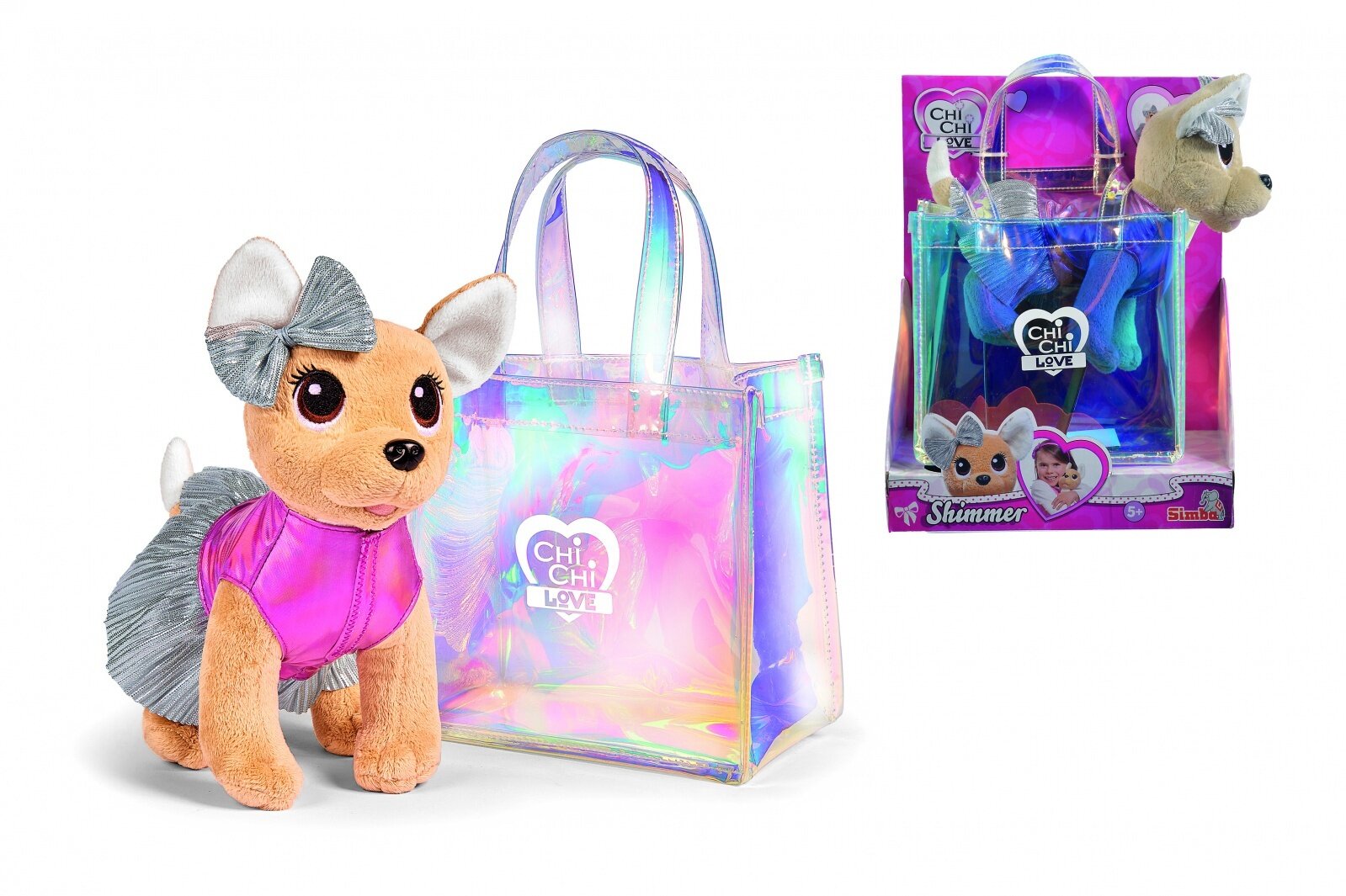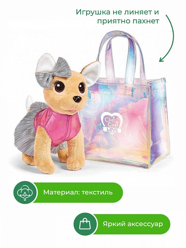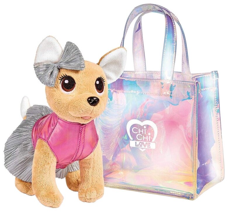 Собачка Chi-Chi Love следит за модными трендами! На ней стильное платье с плиссированной юбочкой и блестящий бантик на ушках. Сумочка у собачки тоже модная - прозрачная с разноцветными переливами.Собачку можно брать в сумочке с собой на прогулку или использовать сумочку отдельно как аксессуар.