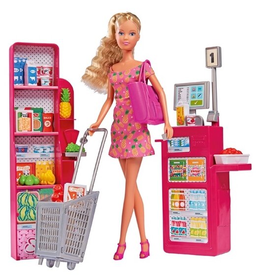 Кукла Штеффи отправляется по магазинам. Она решила организовать домашнюю вечеринку для друзей, поэтому ей нужно приготовить много угощений. Итак, Штеффи берет большую тележку, чтобы все поместилось - овощи, фрукты, сладости и напитки. Штеффи выбрала много продуктов и теперь направляется на кассу, чтобы все оплатить. С помощью такого набора можно объяснить ребенку, как вести себя в магазине и как правильно выбирать продукты.