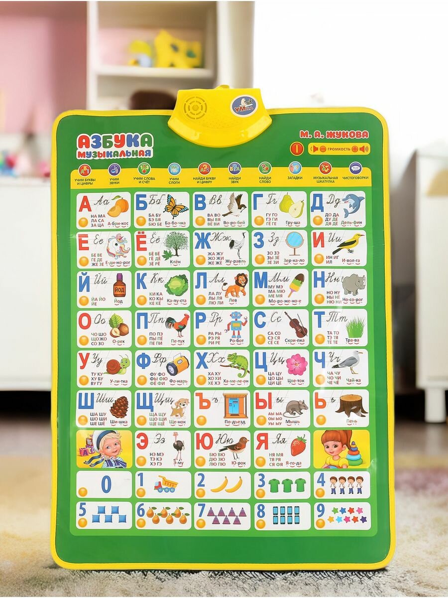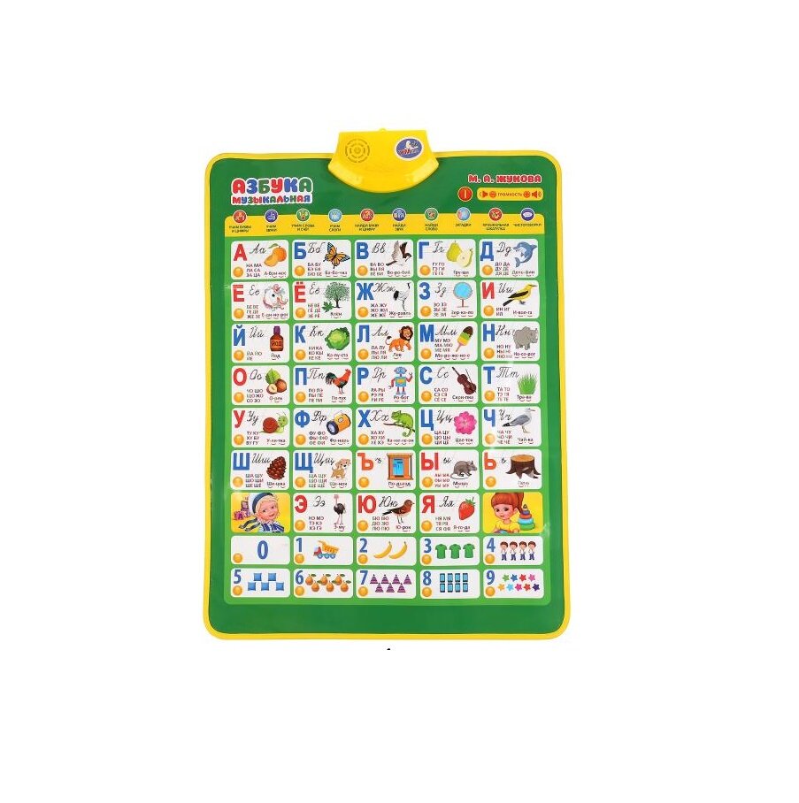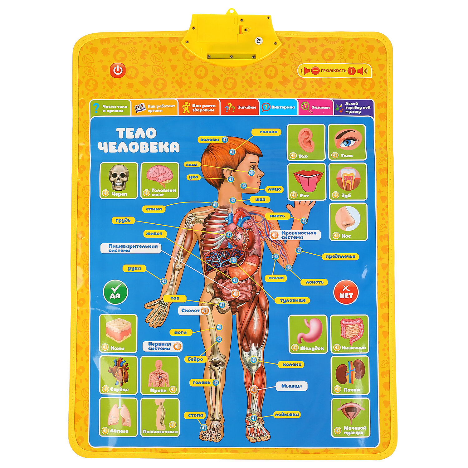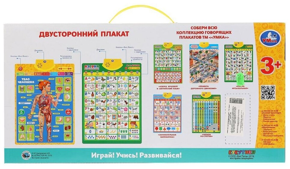 Полезная база для обучения ребёнка в виде обучающего плаката. Преподнесённую в визуальном и звуковом форматах информацию ребёнку будет проще усвоить и запомнить. Малыш с удовольствием будет нажимать на разнообразные кнопки и в лёгкой игровой форме знакомиться с буквами, цифрами и особенностями строения человеческого тела.