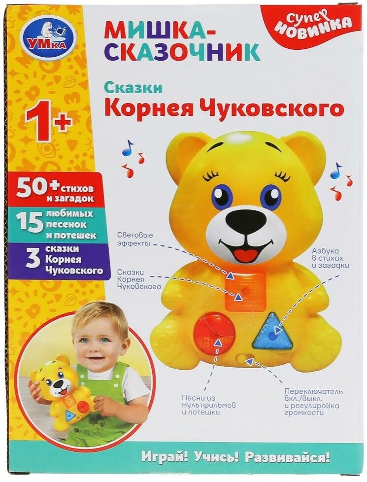 Вашего малыша приведёт в восторг эта игрушка в виде забавного медвежонка с тремя крупными кнопками разной формы. Он с удовольствием будет нажимать на эти кнопки и слушать интересные сказки, весёлые песенки и потешки.