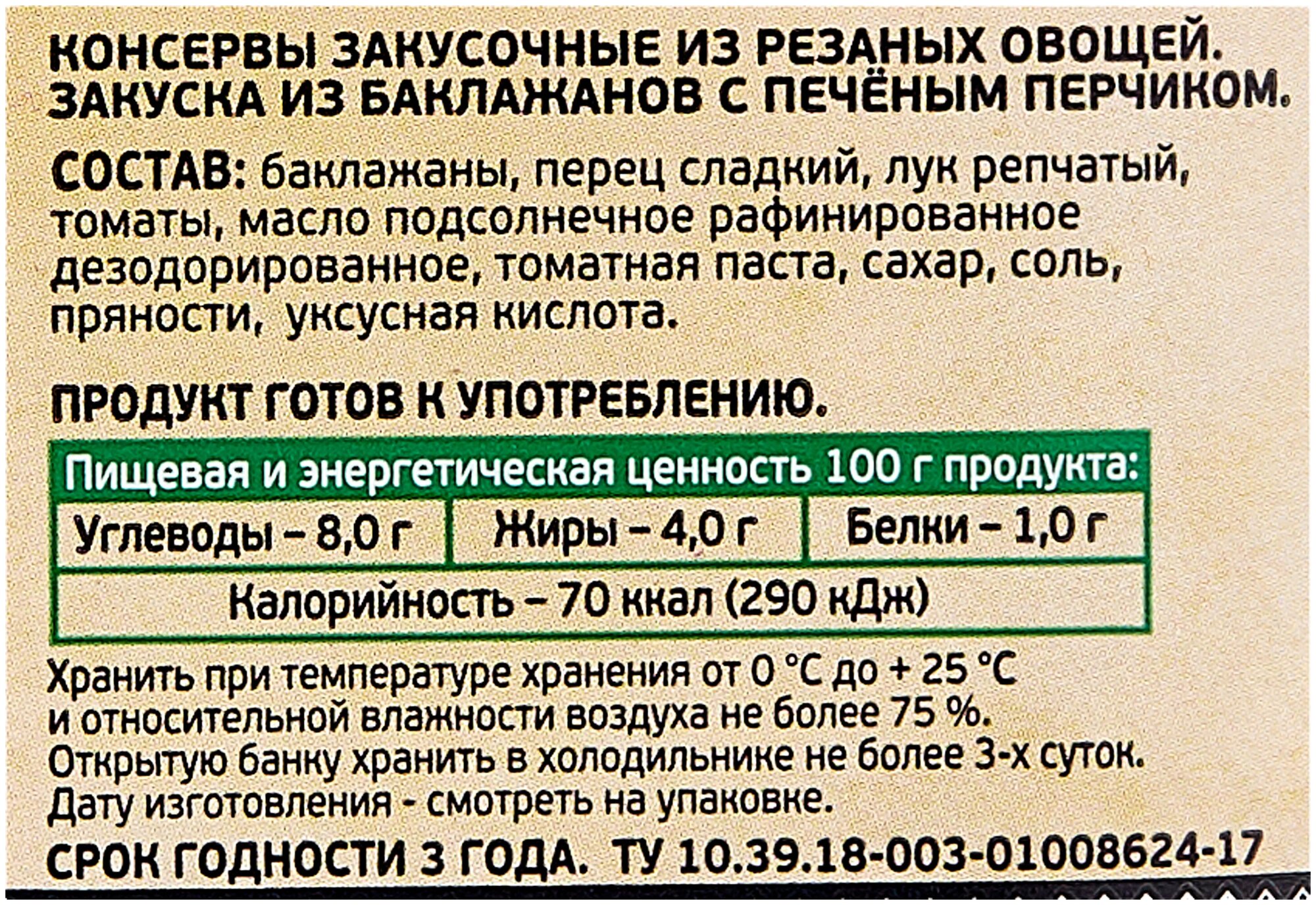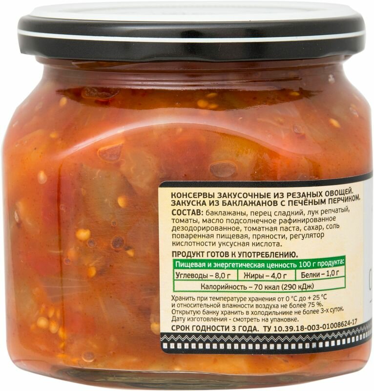 | Состав | баклажаны, перец сладкий, лук репчатый, томаты, масло подсолнечное рафинированное дезодорированное, томатная паста, сахар, соль, пряности, регулятор кислотности |