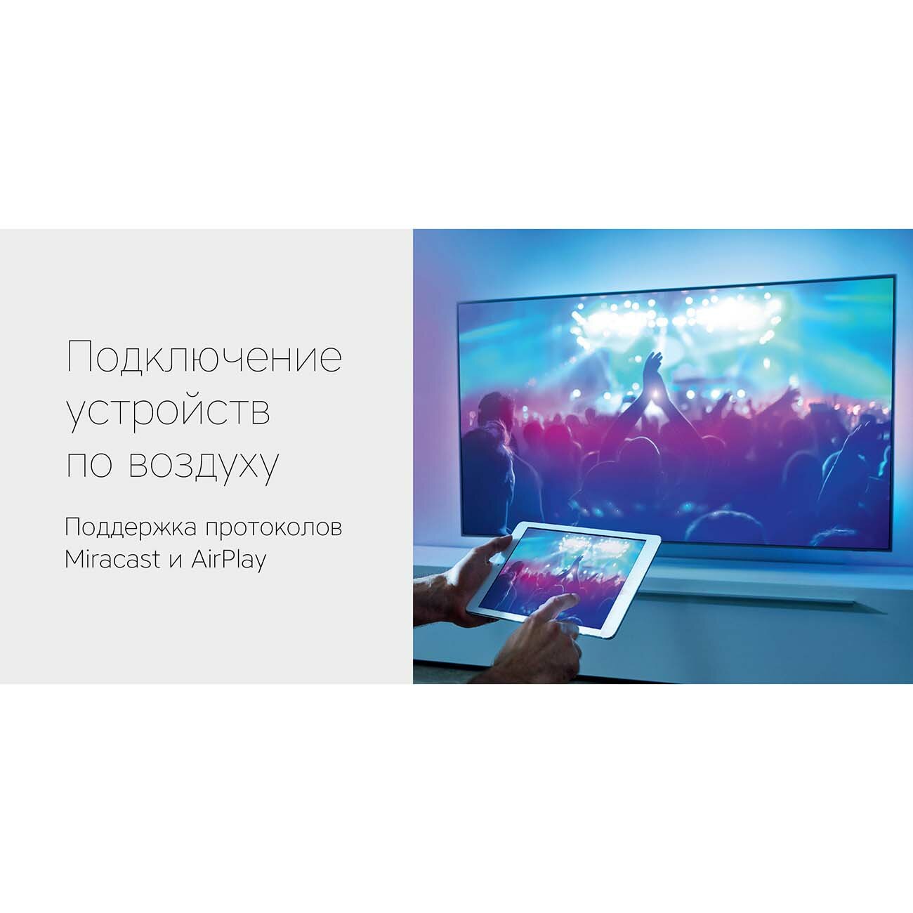 Технологии Miracast и AirPlay позволяют транслировать изображение с мобильных девайсов на ТВ. Есть порты HDMI и USB, а модуль Wi-Fi и разъём LAN открывают доступ в интернет.