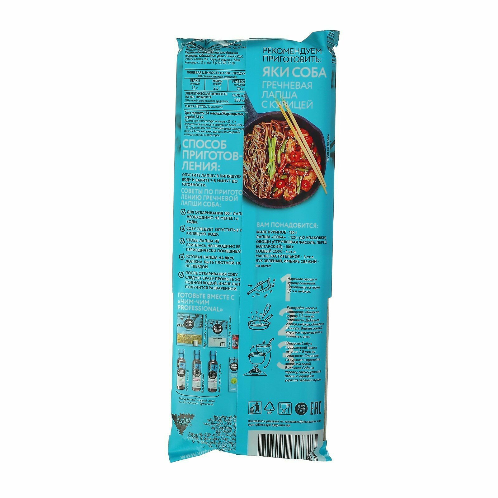 Лапша гречневая "Чим-Чим" Соба это высококачественная гречневая лапша, которая является идеальным вариантом для любителей восточной кухни. Гречневая лапша подходит для приготовления блюд восточной кухни, различных воков, супов, холодных и горячих закусок. Способ приготовления: опустите лапшу в кипящую воду и варить 7-8 минут до готовности, для отваривания 100гр лапши необходимо не менее 1л. воды. чтобы лапша не слиплась необходимо ее периодически помешивать. после отваривания собу следует сразу промыть холодной водой, иначе лапша получится разваренной.