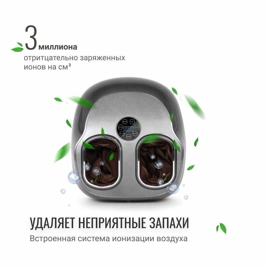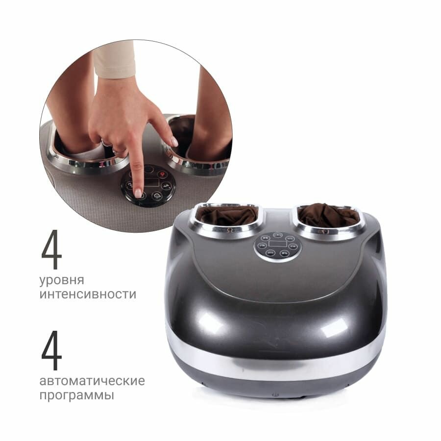 Массажер для ног премиум класса с фитнес эффектом. Данный массажер по некоторому функционалу напоминает виброплатформу. При различных режимах вы почувствуете эффект от процедуры от стопы до бедра. Его технические возможности позволяют заменить несколько массажеров и забыть про усталость в ногах. Массажер для ног c усовершенствованной системой массажа всей стопы, 4 автоматическими программами, встроенной технологией очистки воздуха c системой устранения запахов при помощи отрицательно заряженных ионов, прогревом с 2 уровнями. Такой массажер расслабляет, снимает напряжение, освежает и избавляет от усталости, осуществляет комплексное воздействие на стопы, улучшает эластичность связок и работоспособность мышц. Массажер мощный: с 2 моторами и компрессором для каждого отдельного вида массажа. Принцип работы массажера основан на встроенных массажных роликах, акупунктурных пластинах и воздушно-компрессионных подушках. Все массажные механизмы расположены для тщательной проработки сразу всей стопы & #40;свод стопы, пальцы, пяточную область& #41;. Аппарат сочетает в себе роликовый, акупунктурный, поколачивающий и воздушно-компрессессионный виды массажа. Массажер работает от сети, он компактный и не занимает много места. А стильный дизайн впишется в интерьер дома или офиса.