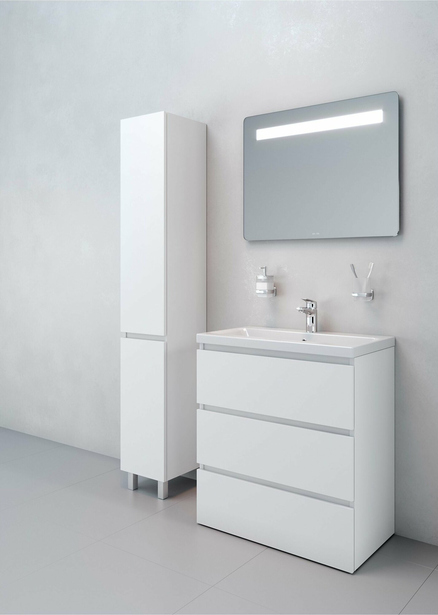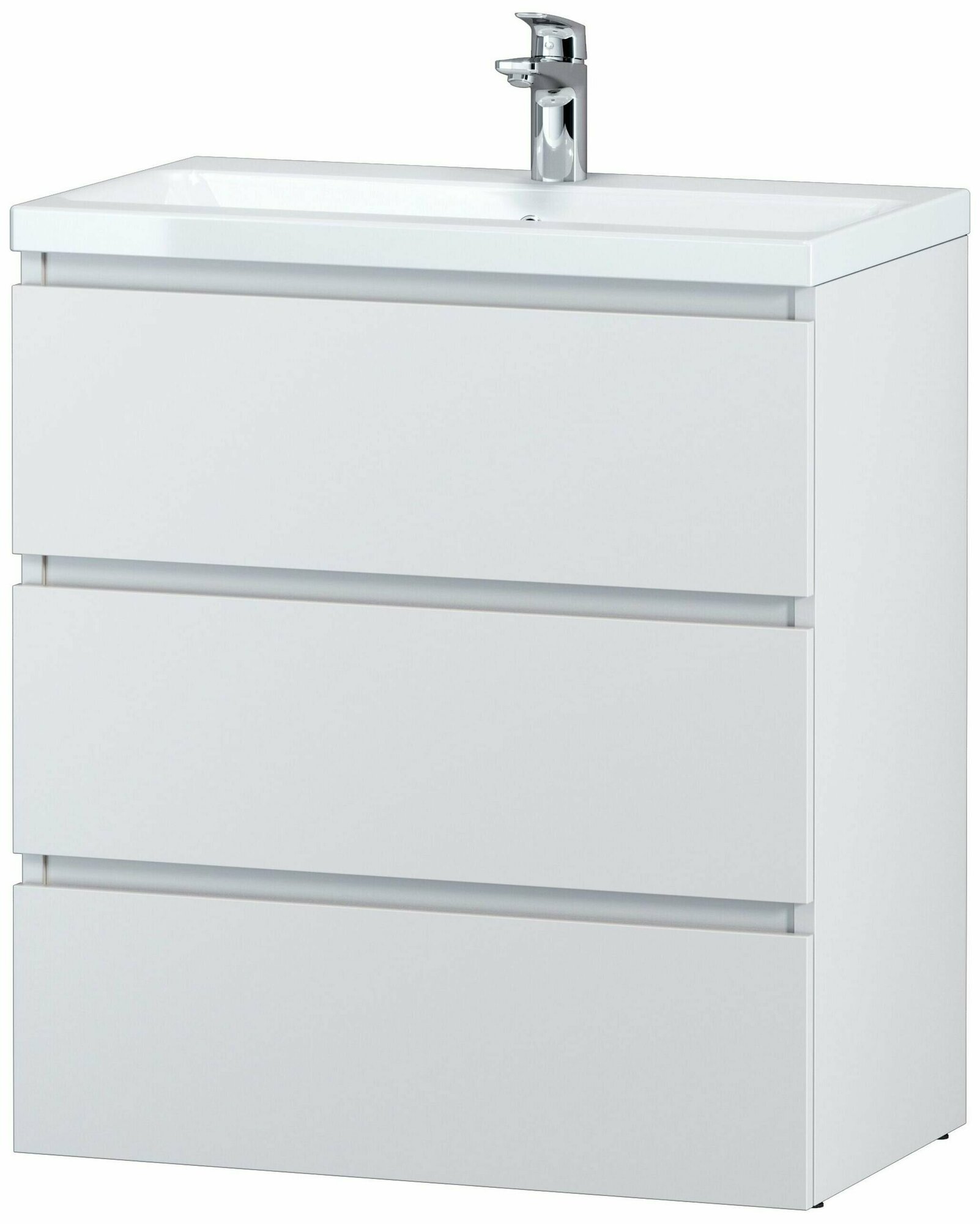 Современный европейский дизайн от DanelonMeroni (Великобритания/Италия). Уникальный нижний ящик базы может быть использован как: выдвижная подставка для детей, для удобного мытья рук (выдерживает нагрузку до 60 кг); дополнительная ниша для хранения (экономия пространства ванной комнаты). Ящики с антискользящим покрытием цвета антрацит – европейский стандарт. Повышенная влагостойкость мебели: окрашенные в 7 слоев поверхности мебели в цвете белый глянец , влагостойкая плита мебели в цвете белый глянец.