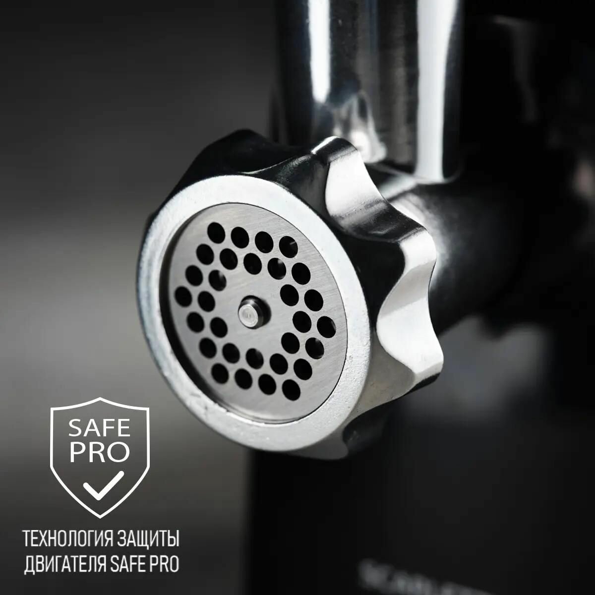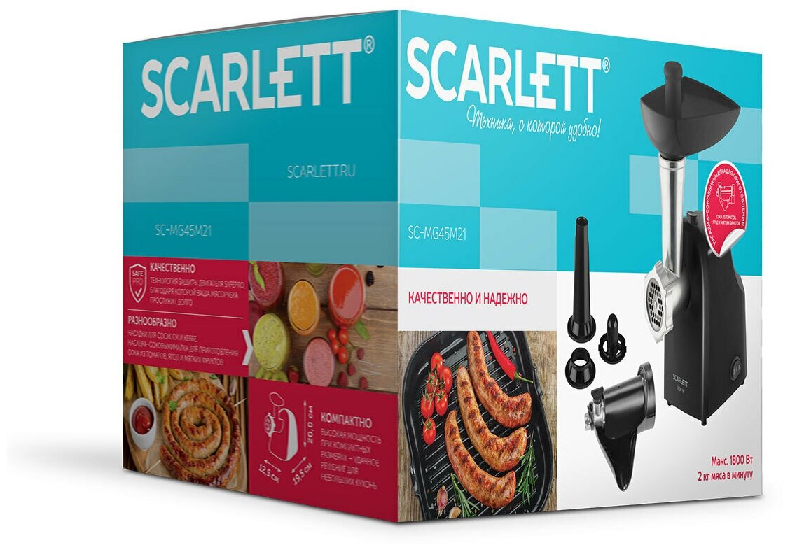 Электромясорубка Scarlett идеально подходит для приготовления привычных блюд и гастрономических изысков. Компактный прибор способен справиться с жёстким и даже жилистым мясом. Высокая мощность 1800 Вт позволяет за минуту произвести 2 кг фарша.