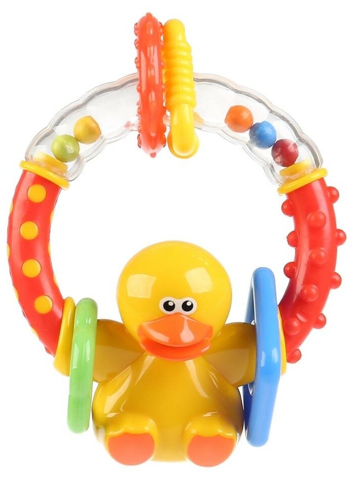 Погремушка выполнена из прочного, гипоаллергенного материала. Во время игры звуки гремящих шариков и подвижных колец привлекают внимание малыша и успокаивают его.
