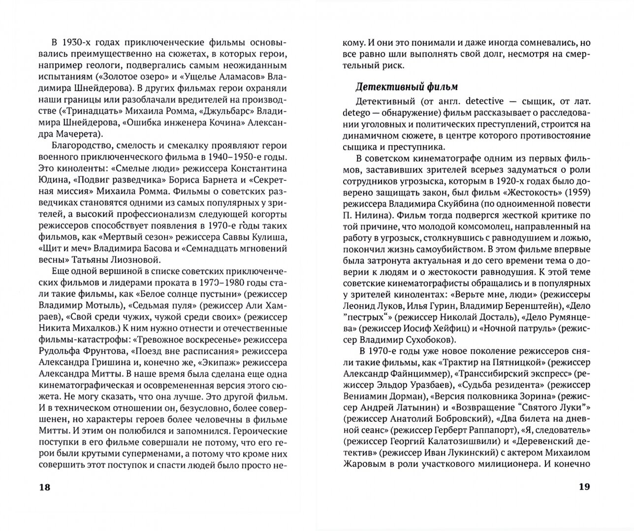 Далее идёт достаточно длинное введение в которых идут сведения об основных жанрах кино (таковыми обозначены: историческое кино, биографическое, военное, приключенческое, детективное, кинодрама, комедия, детский фильм, телесериал). И всё как-то неточно и спорно (например, в разделе «Биографический фильм» фильм «Укрощение огня» связан с эпизодическим И.В.Курчатовым и совсем не упомянут С.П.Королёв). «Ошибка резидента» и «Судьба резидента» попали в раздел «Военный фильм». Там же «Утомлённые солнцем». Фильм «Жестокость» никак не детектив. Дилогия С.Герасимова о Петре Первом – вряд ли детское кино.