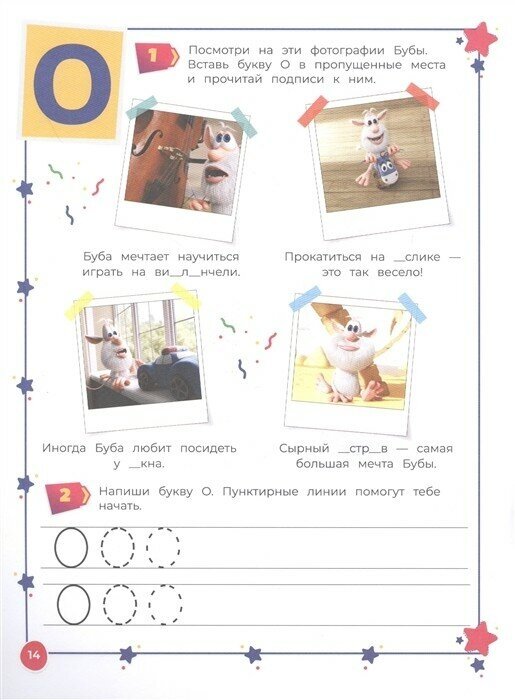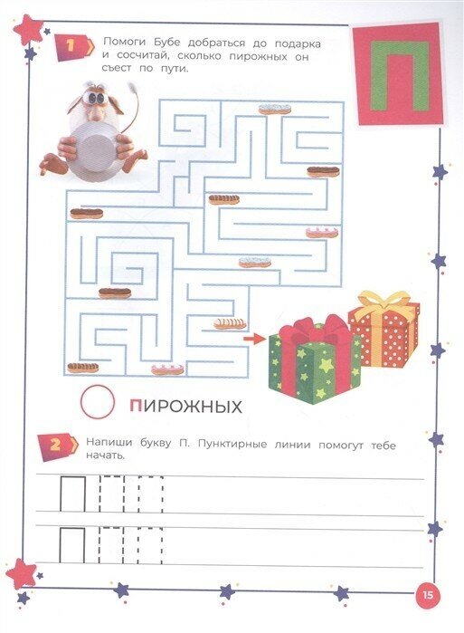 Ребенок будет узнавать букву в именах любимых героев, их любимой еде и увлечениях. Здесь есть отдельные поля, чтобы практиковать написание буквы: сначала по пунктиру, затем самостоятельно. Задания на чтение, память, мелкую моторику помогут детям подготовиться к школе и полюбить уроки.