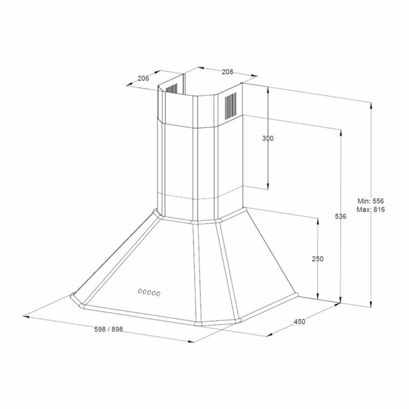 Вытяжка имеет ширину 45 см, что позволяет установить ее над варочной поверхностью. При этом высота составляет 81,6 см, а глубина — 59,8 см. Благодаря этому устройство не занимает много места на кухне.