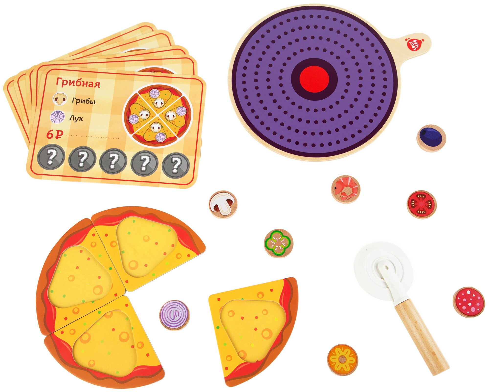 | Состав набора | подставка для пиццы, 4 детали-кусочки пиццы, 42 фишки с изображением ингредиентов, 5 двухсторонних карточек с рецептами, деревянный нож для пиццы |