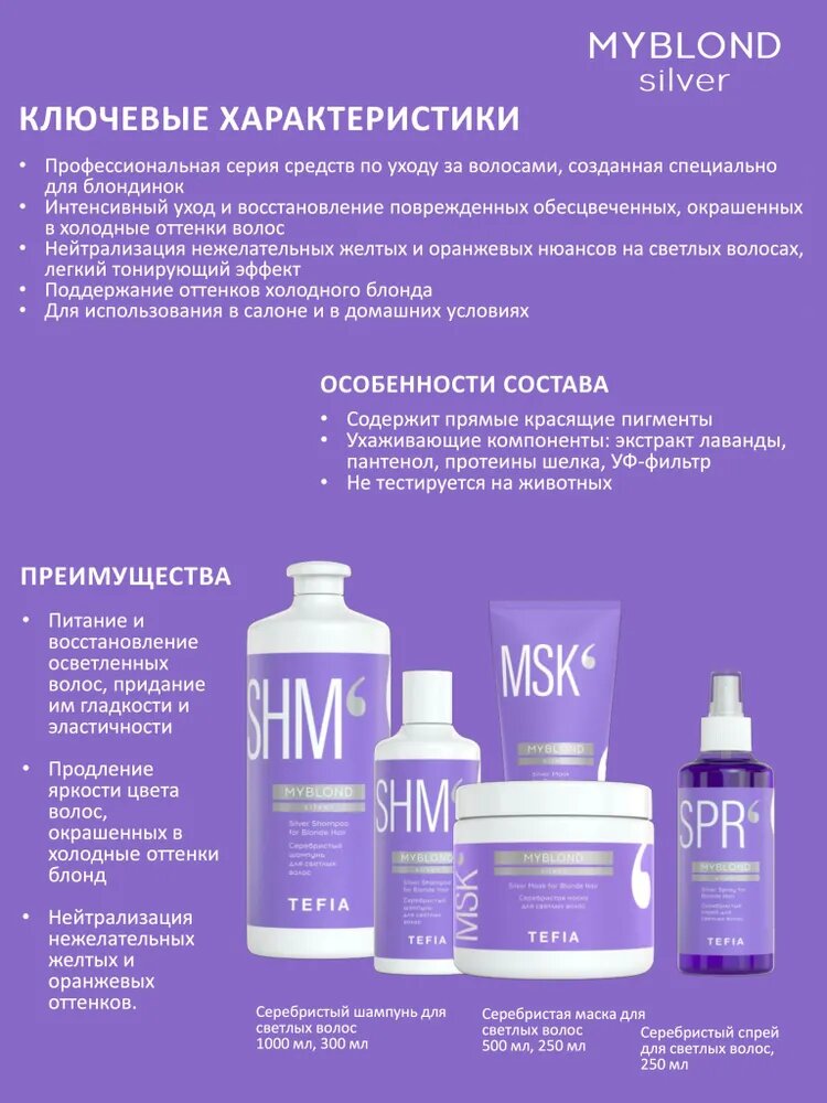 Экстракт лаванды оказывает укрепляющее действие, препятствует ломкости волос. Пантенол и протеин шелка питают и восстанавливают волосы, придавая им гладкость и эластичность. УФ-фильтр защищает волосы от негативного воздействия солнечного излучения. При регулярном применении продлевает яркость цвета волос, окрашенных в холодные оттенки блонд. Позволяет избавиться от нежелательного желтого оттенка седых или обесцвеченных волос. Придает дополнительный блеск и сияние натуральным светлым волосам. Содержит прямые фиолетовые пигменты. Обладает нежной прохладно-свежей лавандовой отдушкой