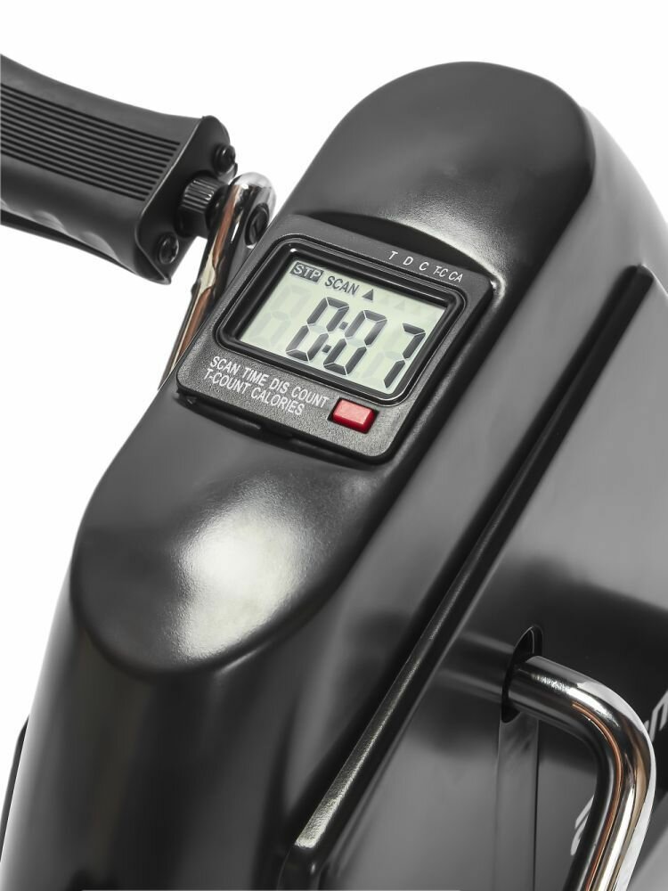 Велотренажер для аэробной нагрузки, оснащен миникомпьютером, который показывает необходимые параметры тренировки: время, пройденную дистанцию, количество потраченных калорий, счет (количество оборотов) и итоговый счет (количество оборотов сделанных от замены батареи до замены батареи).