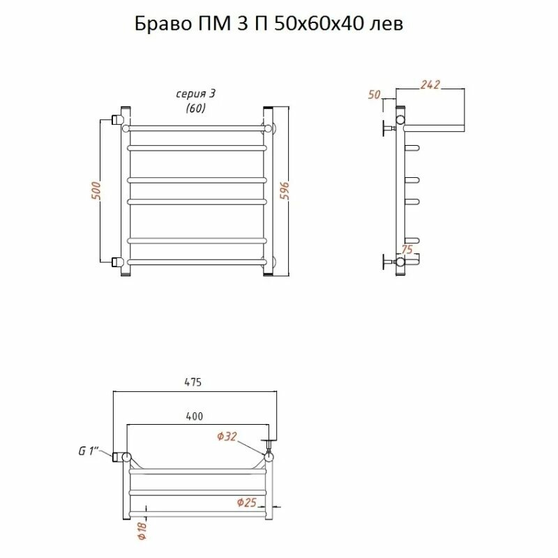 Полотенцесушитель Тругор Браво ПМ 3 П 50*60*40 (ЛЦ4) лев (Браво3/ПМ506040 П лев) Браво3/ПМ506040Плев