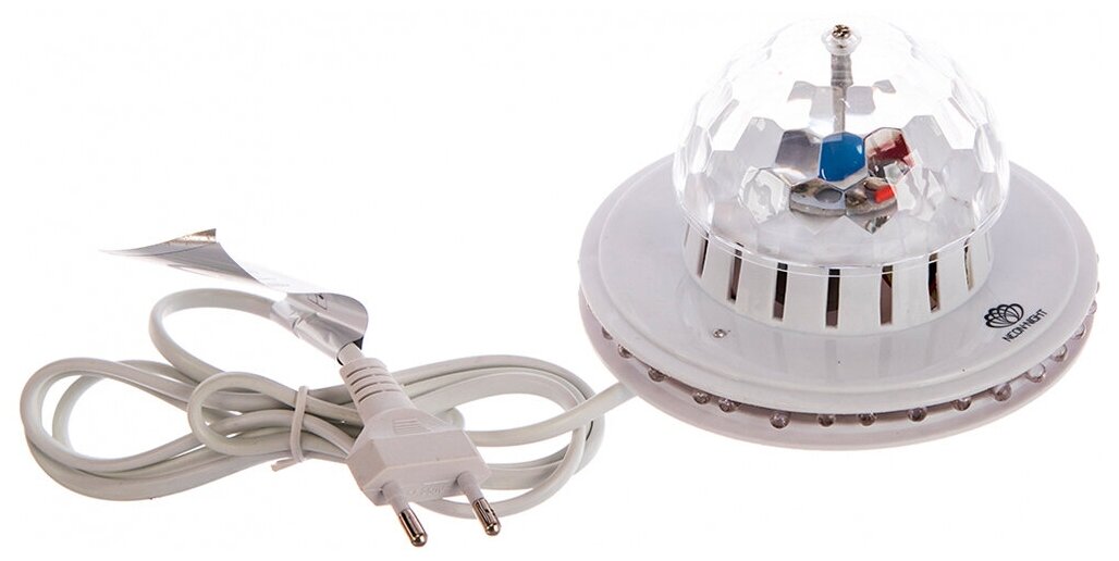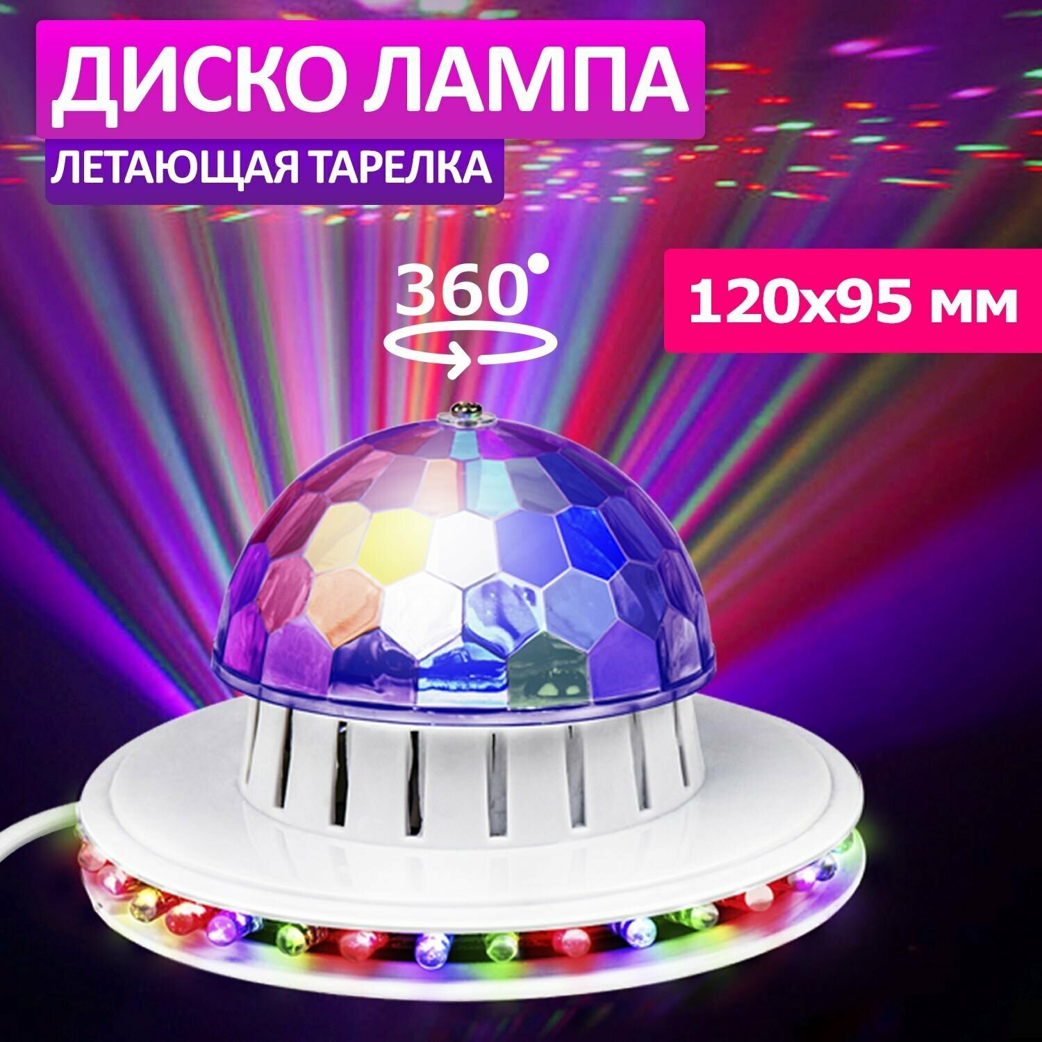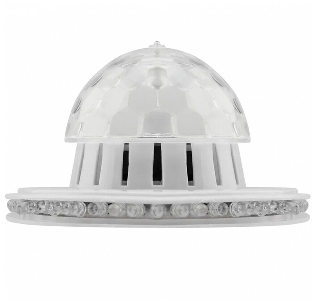 Диско-лампа «Летающая тарелка» работает от стандартной розетки с напряжением 230 Вольт и создает эффект светомузыки, которая традиционно является частью любой веселой вечеринки. Изделие выполнено в виде прозрачного вращающегося купола на подставке. Внутри корпуса располагаются 3 ярких светодиода RGB, 33 диода обрамляют кромку «тарелки». Во включенном состоянии лампа создает динамическое вращение и разносит поток ярких лучей на стены и потолок. Остается лишь приглушить основное освещение и добавить зажигательную музыку — подходящая атмосфера для вечеринки готова!
