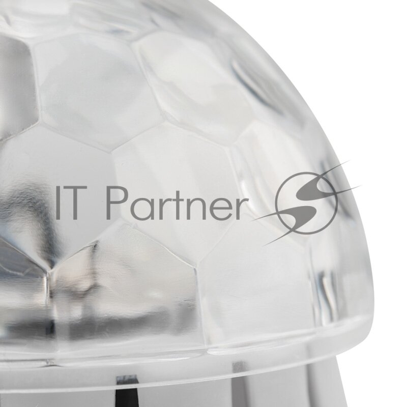 Оригинальная настольная диско-лампа используется для создания вечеринки и праздничной атмосферы в любом помещении. Эффект цветомузыки достигается с помощью разноцветных светодиодов, преобразованных в переливающиеся лучи. Отверстия в корпусе позволяют смонтировать лампу на стену или потолок.