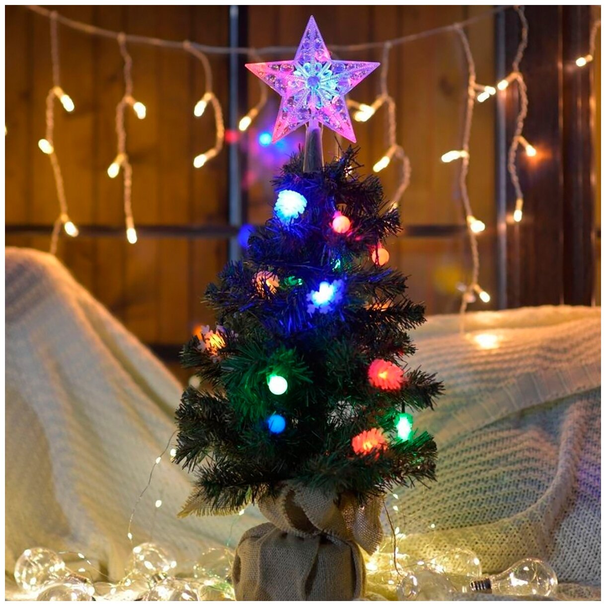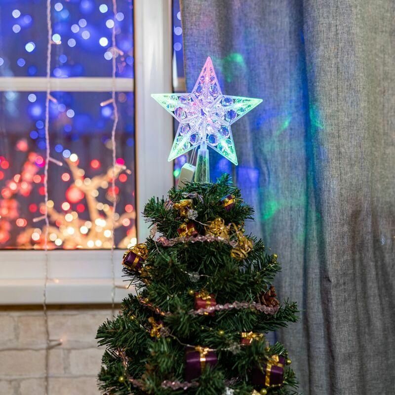 Светодиодная макушка устанавливается на верхнюю часть каркаса или ствола главного символа Нового года. Яркие лучи хаотично меняют цвета, отражаясь на стенах и мебели для обеспечения по-настоящему сказочной атмосферы. Наконечник в форме звезды комплектуется проводом подключения длиной 2 метра.