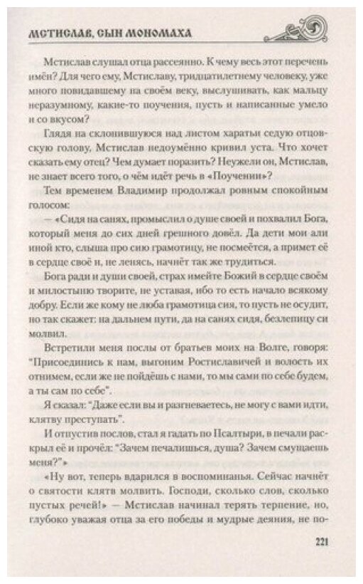 Для новгородцев Мстислав тоже не стал "своим", и потому его тяготит чувство одиночества. Даже повзрослев, он живёт как будто сам по себе, не чувствует себя Мономаховичем и потому лишь усмехается, когда отец читает ему своё "Поучение". Лишь позднее сын Мономаха поймёт, что в "Поучении" сокрыт бесценный опыт! Мстиславу суждено пройти долгий и тернистый путь, чтобы в итоге набраться мудрости и стать продолжателем отцовского дела по "собиранию Руси" в единый кулак.