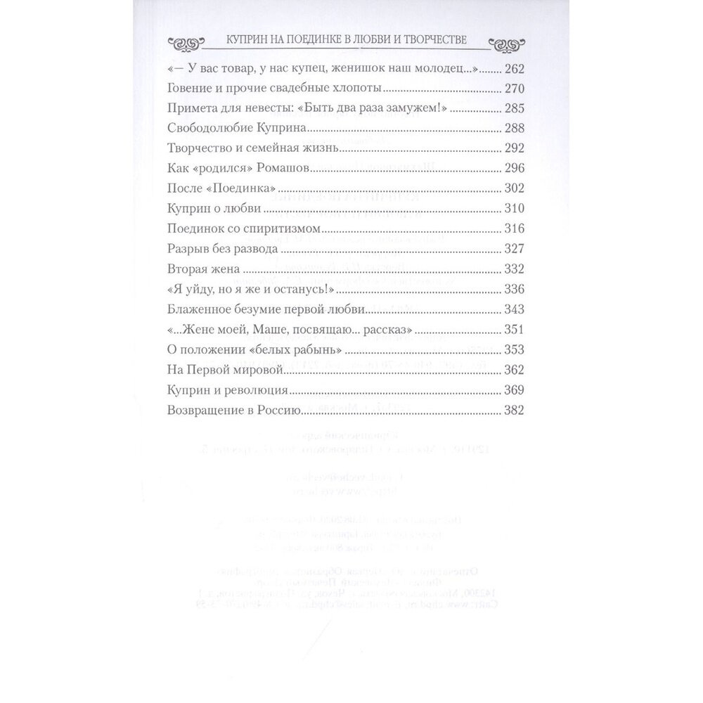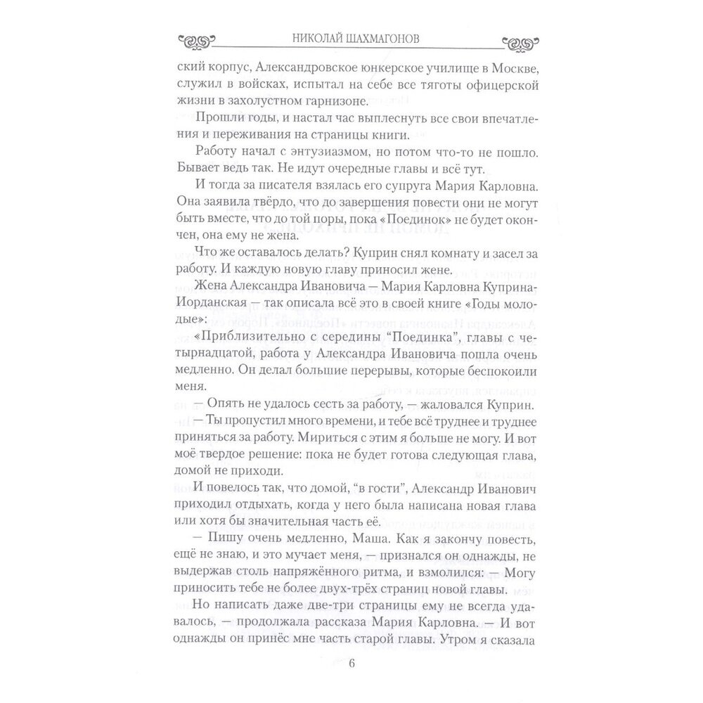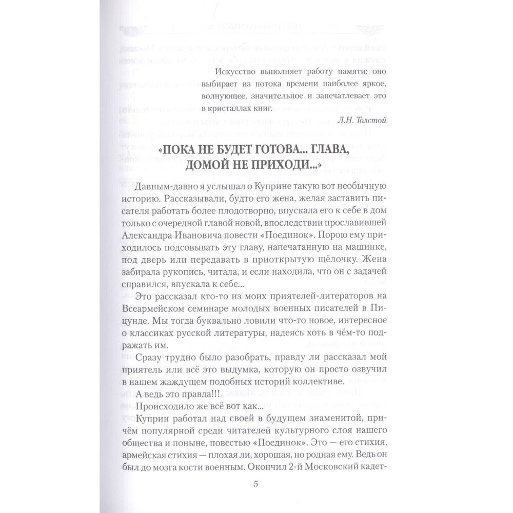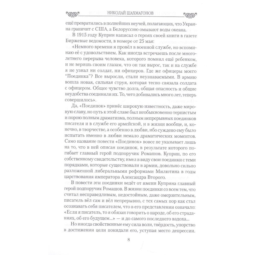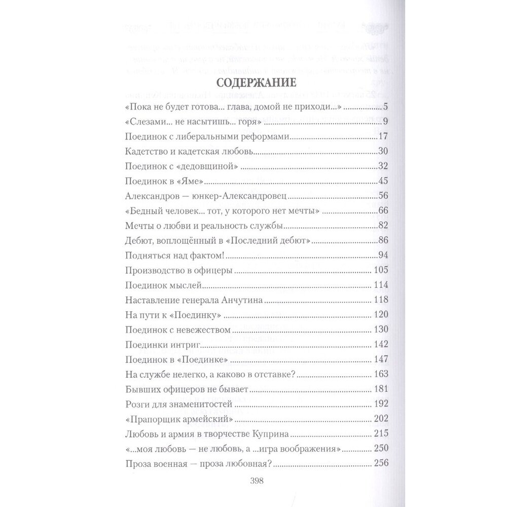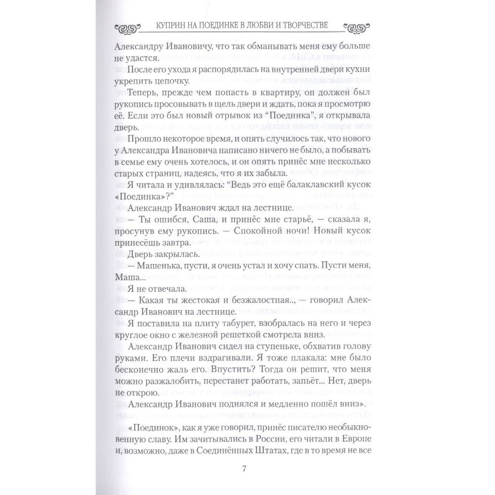 В книге приоткрываются тайны создания известных произведений Александра Куприна — «Яма», «Гранатовый браслет», «Юнкера». Немалое место в настоящем издании посвящено знаменитой повести «Поединок», в которой писатель рассказывает не только о дуэли подпоручика Ромашова и капитана Николаева, но и о многих поединках, случавшихся на протяжении его жизни, в любви, супружестве, армейской службе и творчестве. Читатель узнает о любовных увлечениях Куприна, драмах его супружеских отношений, о душевных переживаниях на чужбине и радости возвращения на родину.