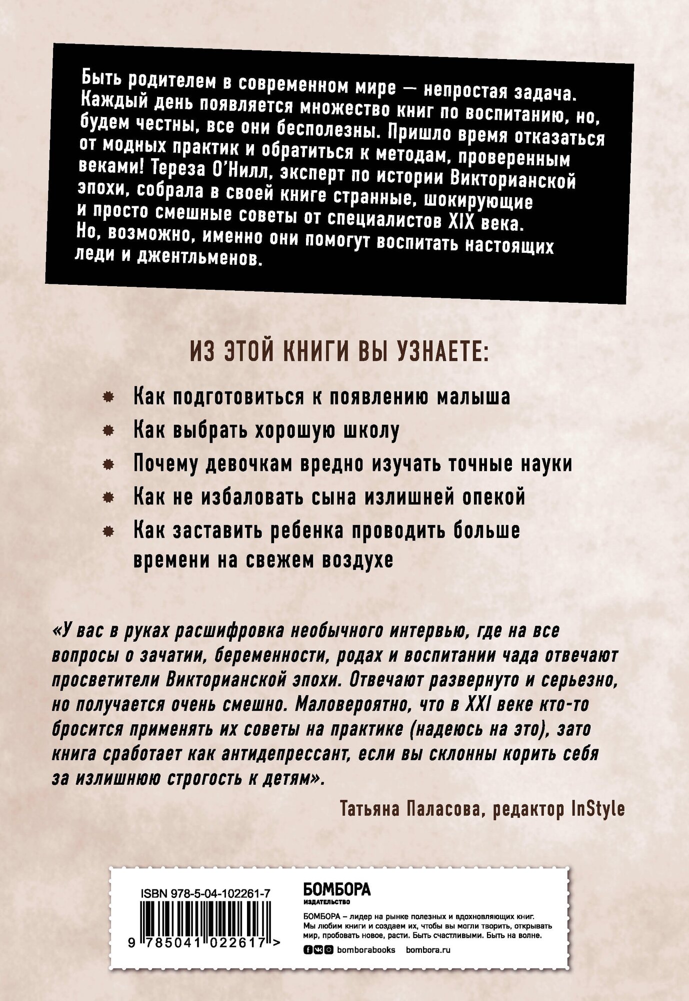 Быть родителем в современном мире — непростая задача. Каждый день появляется множество книг по воспитанию, но, будем честны, все они бесполезны. Пришло время отказаться от модных практик и обратится к методам, проверенным веками! Тереза О’Нилл, эксперт по истории Викторианской эпохи, собрала в своей книге странные, шокирующие и просто смешные советы от экспертов XIX века. Но, возможно, именно они помогут воспитать настоящих леди и джентльменов.