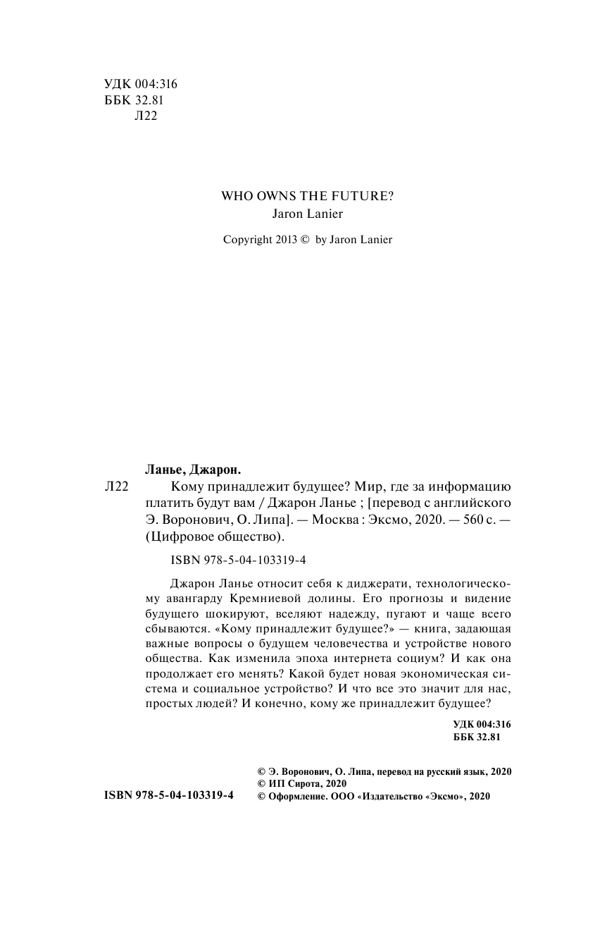 Кому принадлежит будущее? Мир где за информацию платить будут вам (Ланье Джарон); ООО "Издательство "Эксмо", 2020