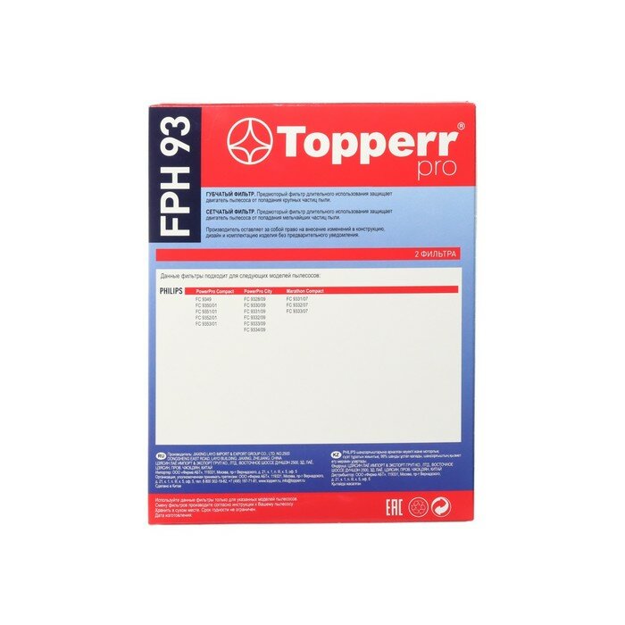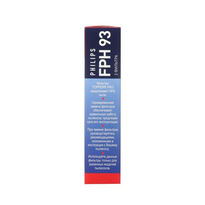 | Прочие особенности и свойства | Набор фильтров FPH 93 предназначен для пылесосов PHILIPS., , В наборе:, , ГУБЧАТЫЙ ФИЛЬТР. Предмоторый фильтр длительного использования защищает двигатель пылесоса от попадания крупных частиц пыли., , СЕТЧАТЫЙ ФИЛЬТР. Предмоторый фильтр длительного использования защищает двигатель пылесоса от попадания мельчайших частиц пыли., , Данные фильтры подходят для следующих моделей пылесосов PHILIPS:, PowerPro Compact, FC 9349, FC 9350/01, FC 9351/01, FC 9352/01, FC 9353/01, , PowerPro City, FC 9328/09, FC 9330/09, FC 9331/09, FC 9332/09, FC 9333/09, FC 9334/09, , Marathon Compact, FC 9331/07, FC 9332/07, FC 9333/07 |