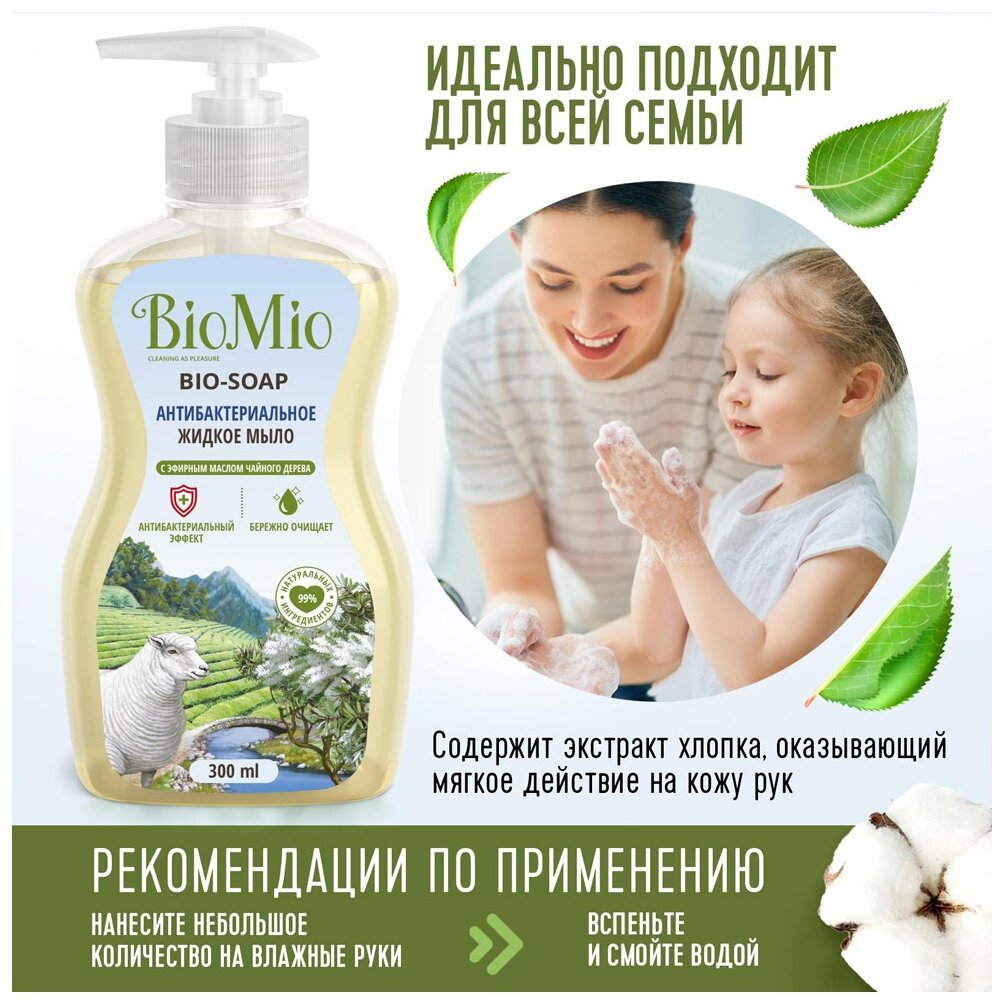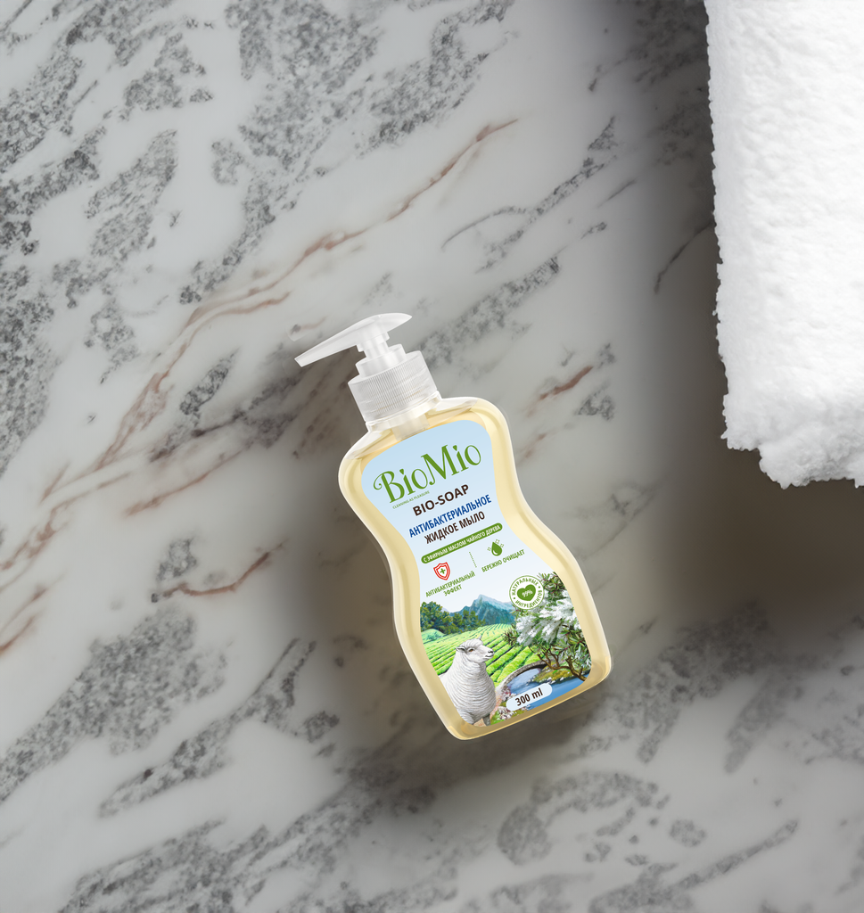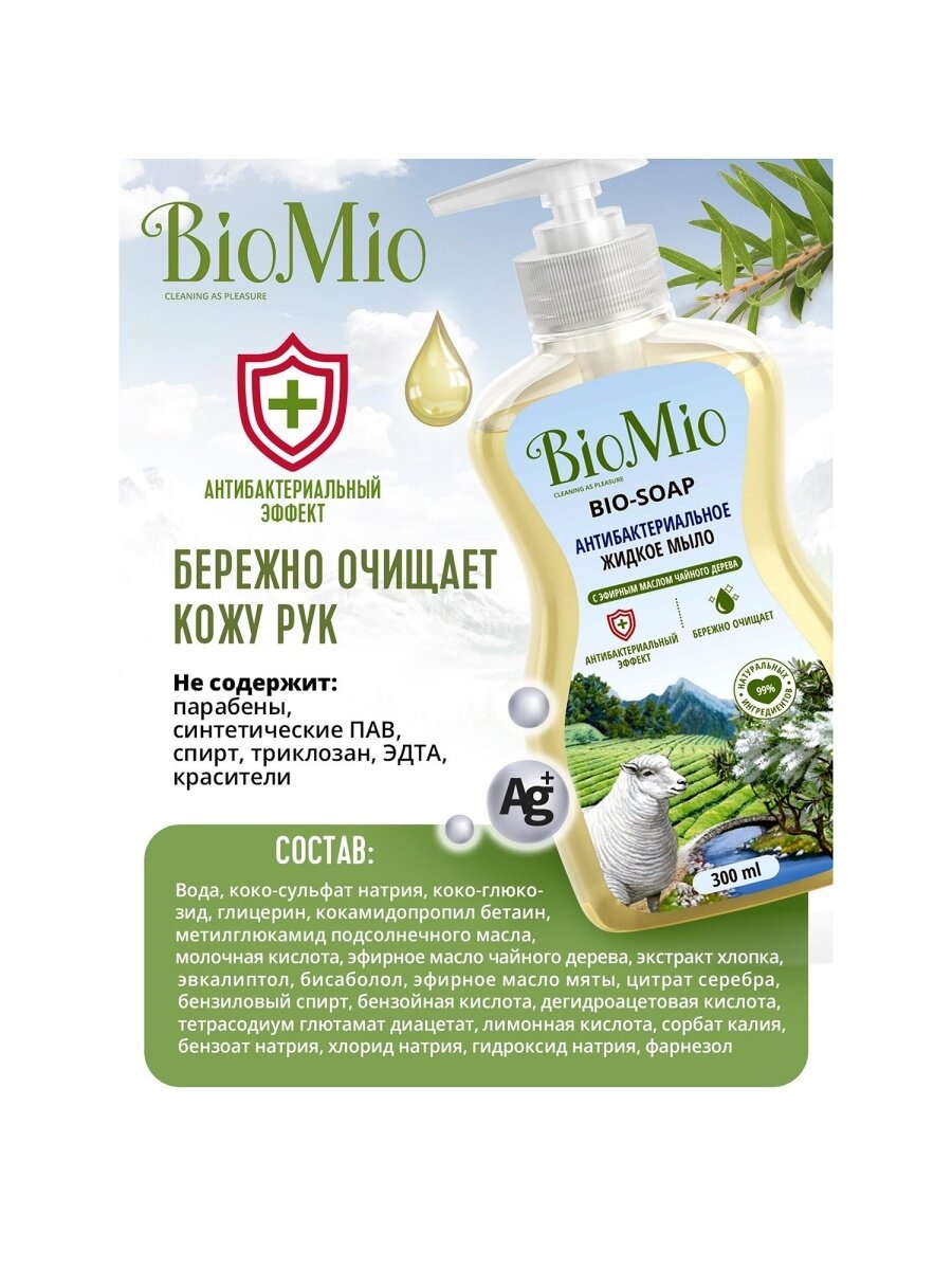 Экологичное антибактериальное жидкое мыло BIO-SOAP с эфирным маслом чайного дерева мягко и деликатно очищает кожу рук, обеспечивая надежную защиту от бактерий благодаря уникальному антибактериальному квадрокомплексу, в состав которого входят ионы серебра, бисаболол, цинеол и эфирное масло чайного дерева.Мыло также содержит экстракт хлопка, оказывающий мягкое действие на кожу рук, а также эфирное масло перечной мяты, которое помогает восстановить силы для новых достижений.НЕ СОДЕРЖИТ: парабены, синтетические ПАВ, спирт, триклозан, ЭДТА, красители.BioMio - линейка эффективных средств для дома, использование которых приносит удовольствие. Продукты, созданные с любовью и заботой, идеально справятся с загрязнениями, оставаясь при этом абсолютно безопасными, экологичными и особенно незаменимыми, если в доме есть малыш.