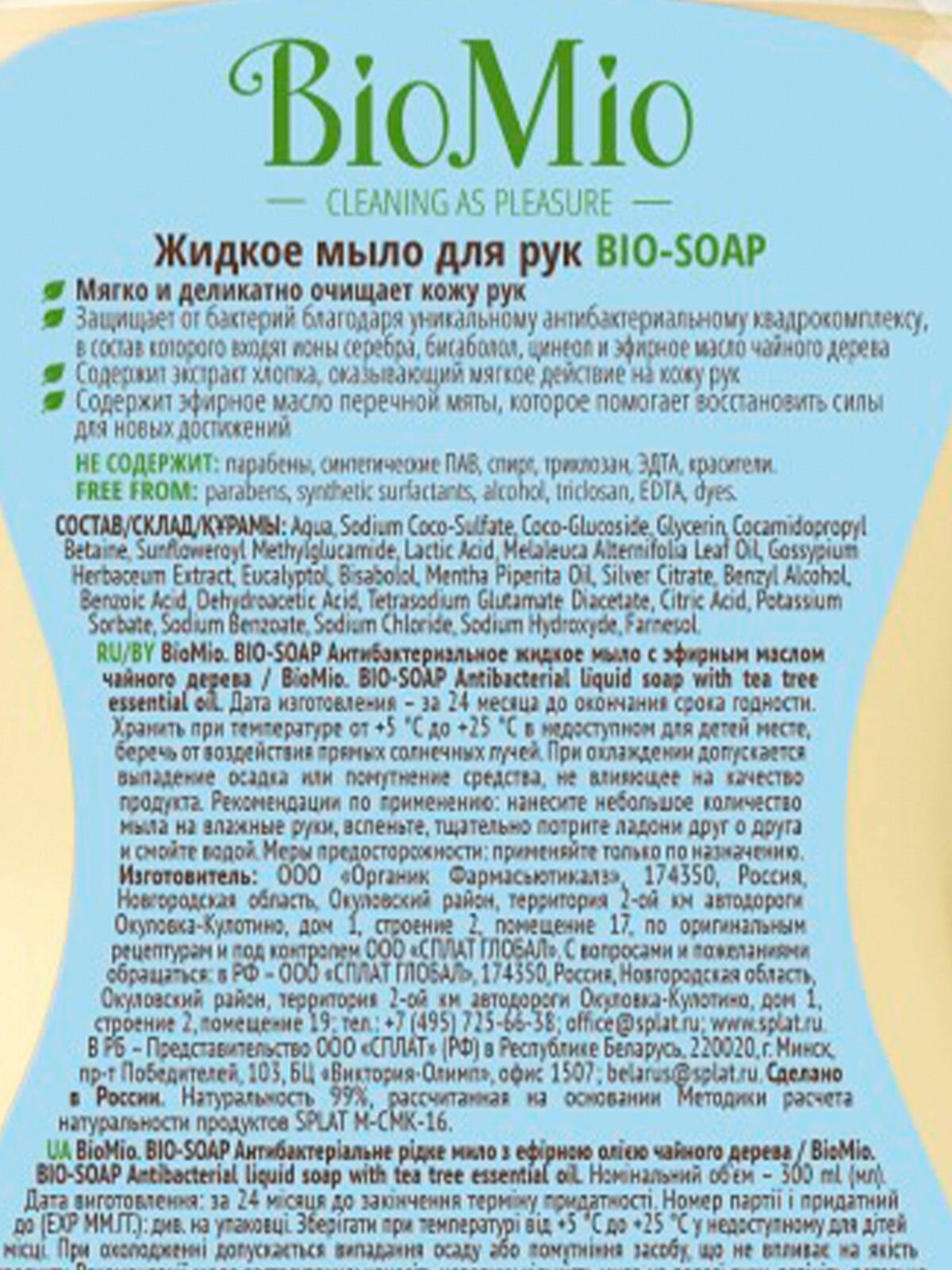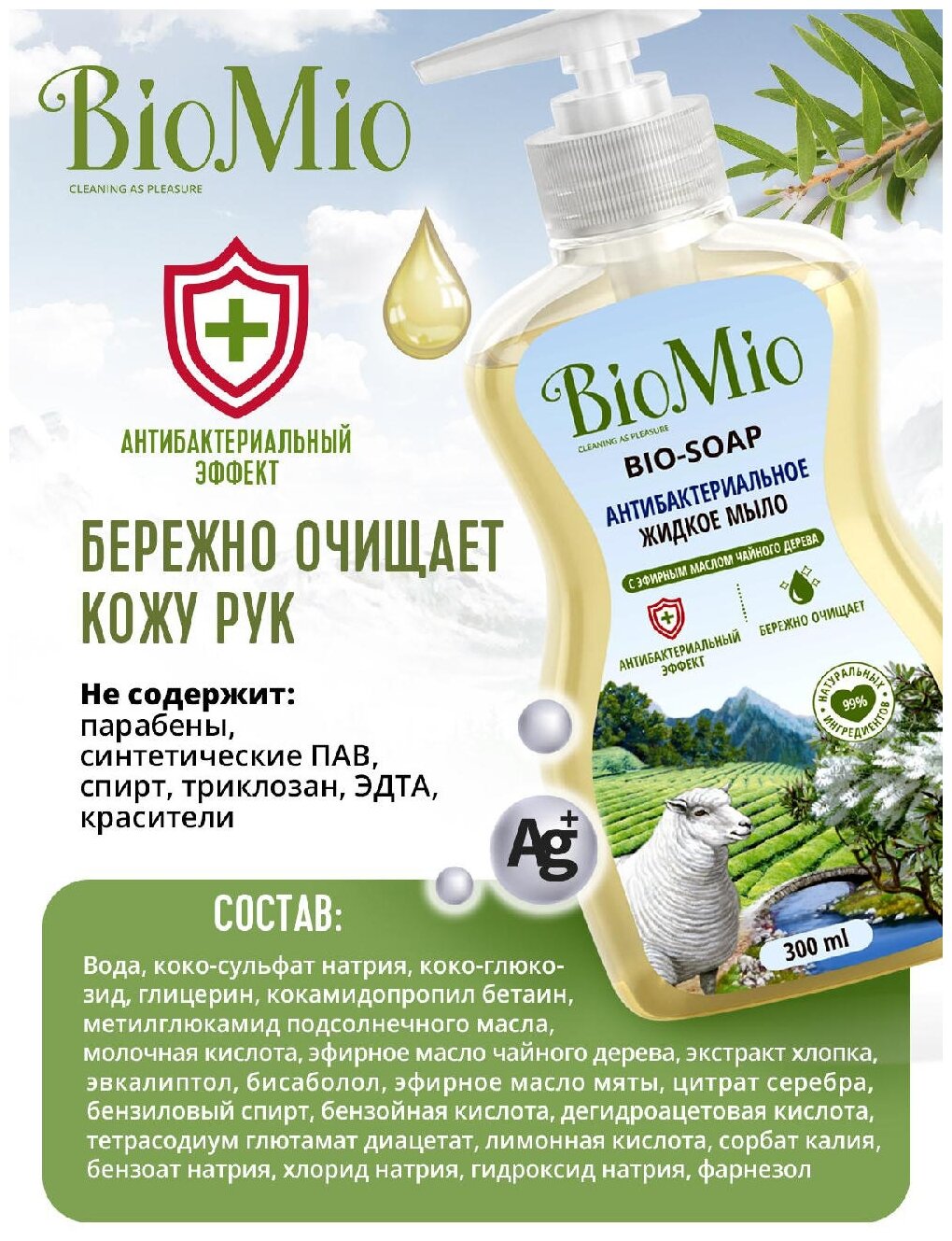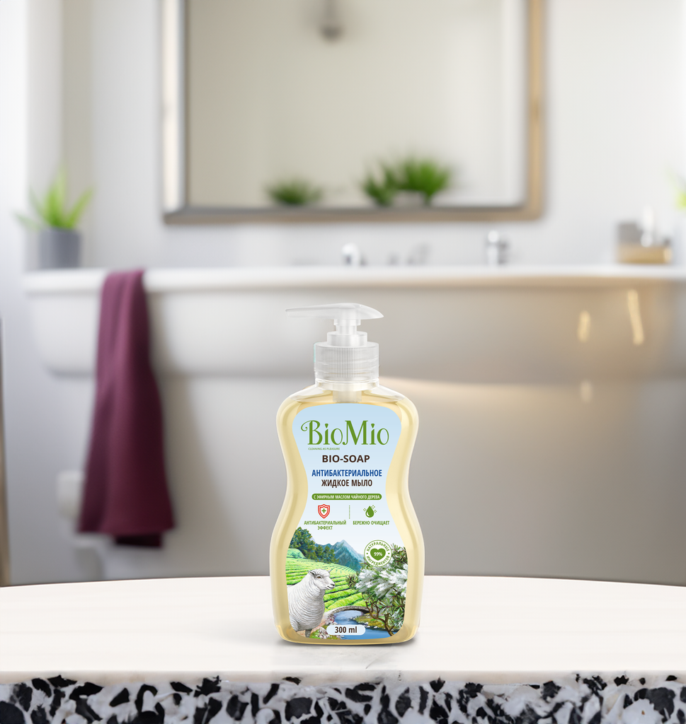 Экологичное антибактериальное жидкое мыло BIO-SOAP с эфирным маслом чайного дерева мягко и деликатно очищает кожу рук, обеспечивая надежную защиту от бактерий благодаря уникальному антибактериальному квадрокомплексу, в состав которого входят ионы серебра, бисаболол, цинеол и эфирное масло чайного дерева.Мыло также содержит экстракт хлопка, оказывающий мягкое действие на кожу рук, а также эфирное масло перечной мяты, которое помогает восстановить силы для новых достижений.НЕ СОДЕРЖИТ: парабены, синтетические ПАВ, спирт, триклозан, ЭДТА, красители.BioMio - линейка эффективных средств для дома, использование которых приносит удовольствие. Продукты, созданные с любовью и заботой, идеально справятся с загрязнениями, оставаясь при этом абсолютно безопасными, экологичными и особенно незаменимыми, если в доме есть малыш.