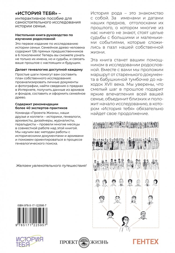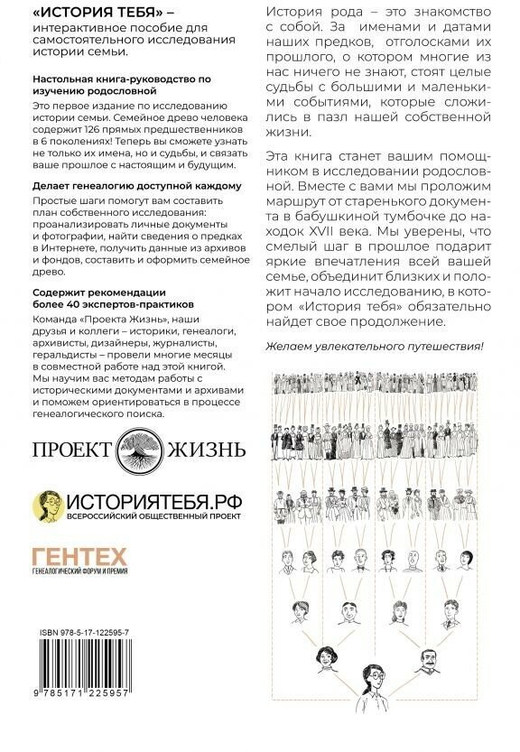 Эта книга станет вашим помощником в исследовании родословной. Вместе с вами мы проложим маршрут от старенького документа в бабушкиной тумбочке до находок XVII века. Мы уверены, что смелый шаг в прошлое подарит яркие впечатления всей вашей семье, объединит близких и положит начало исследованию, в котором "История тебя" обязательно найдет свое продолжение.